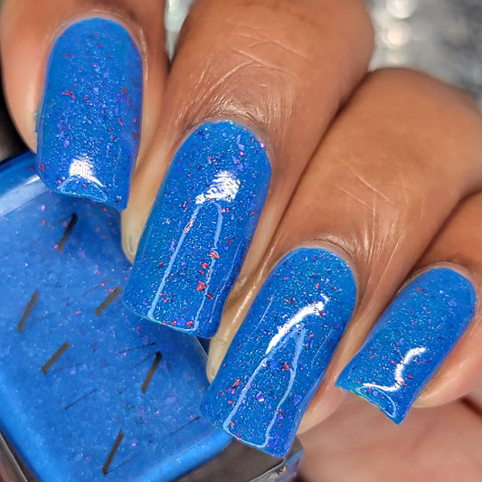 Inspired by Hey Arnold's Halloween Episode Arnold's Halloween. This neon blue polish is loaded with purple and red metallic flakes.