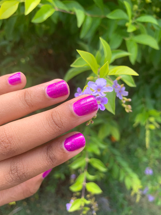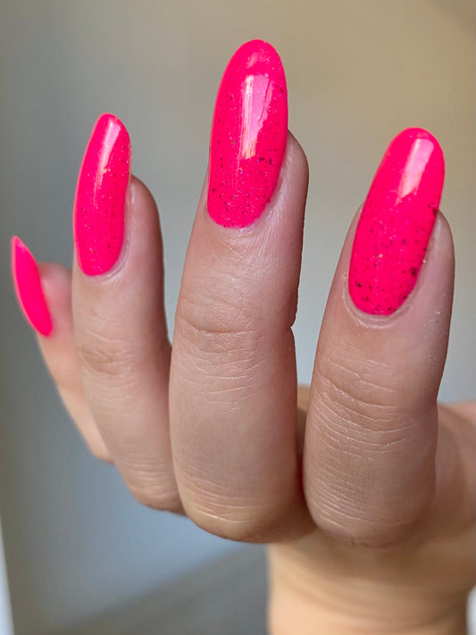 This neon pink polish has a dash of holo and green/pink/gold ucc flakes.