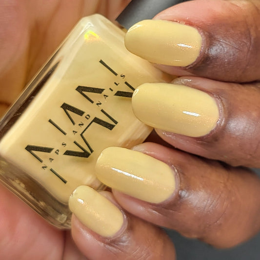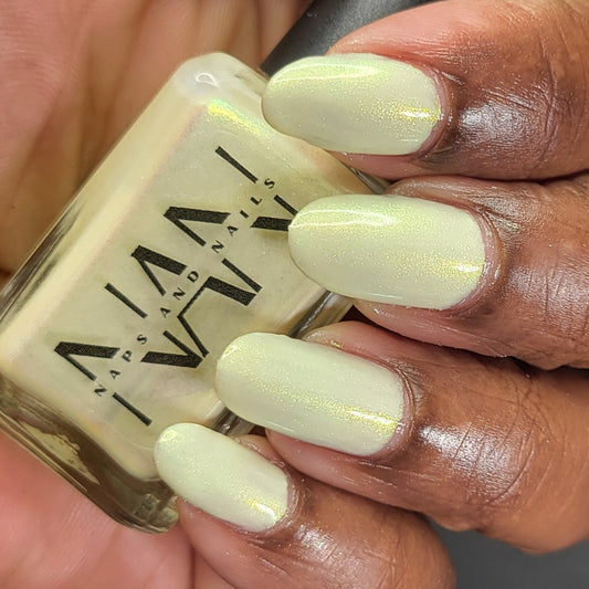 A pastel Blue polish with shimmers of gold, orange and pink.