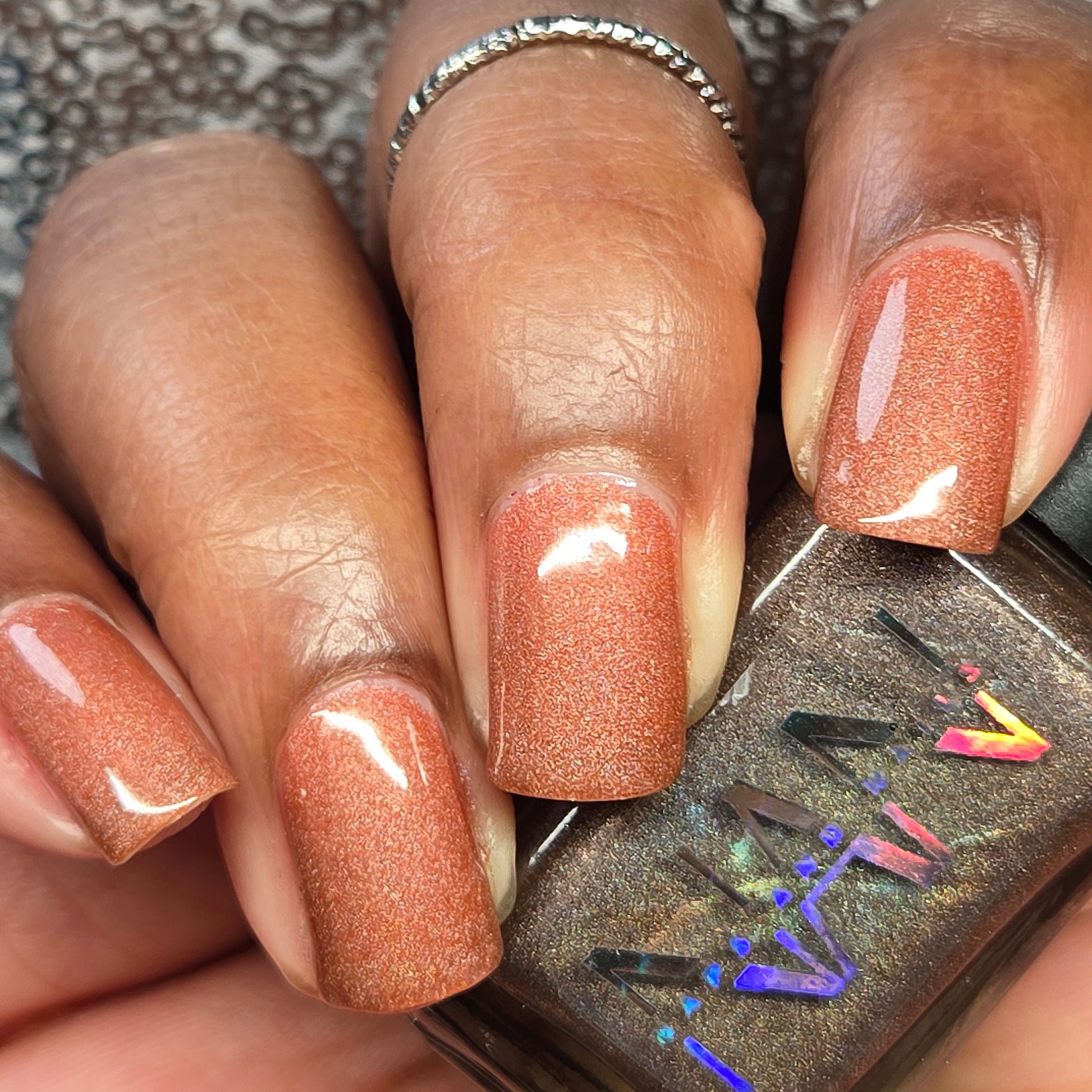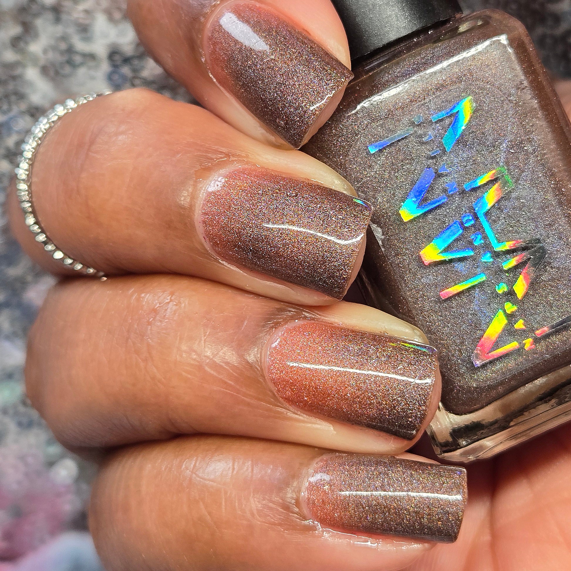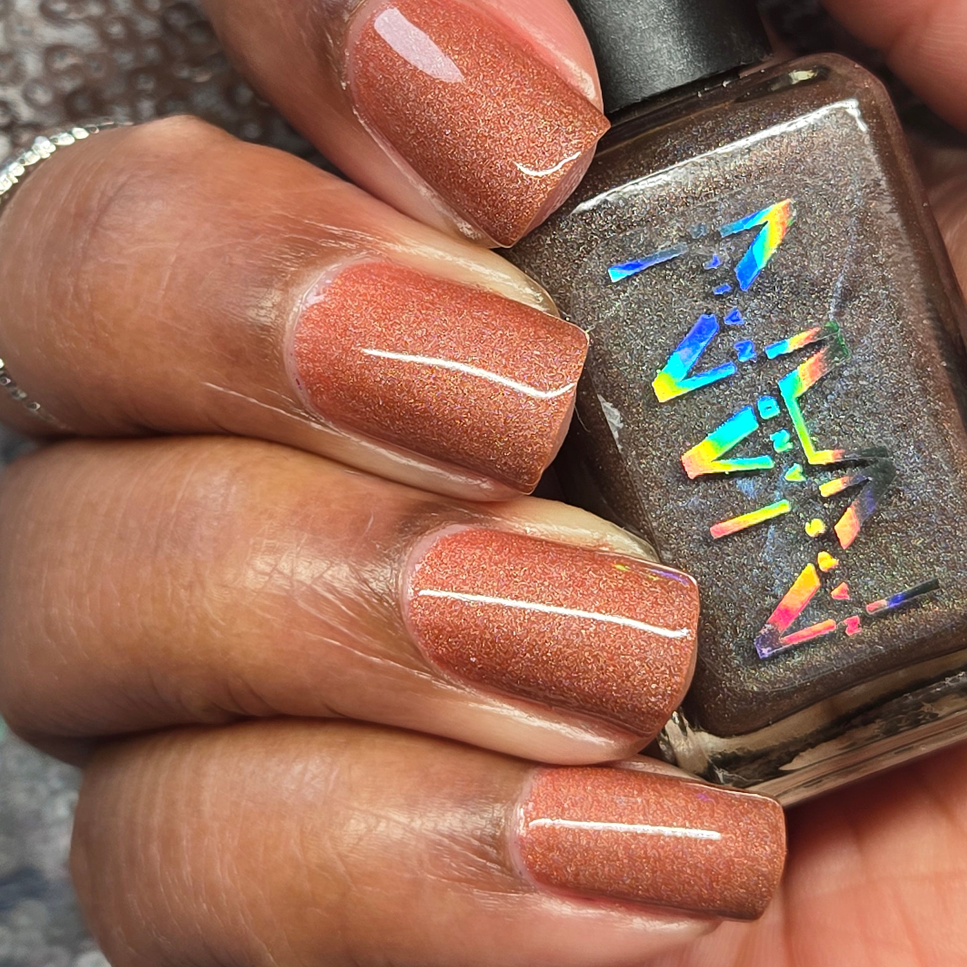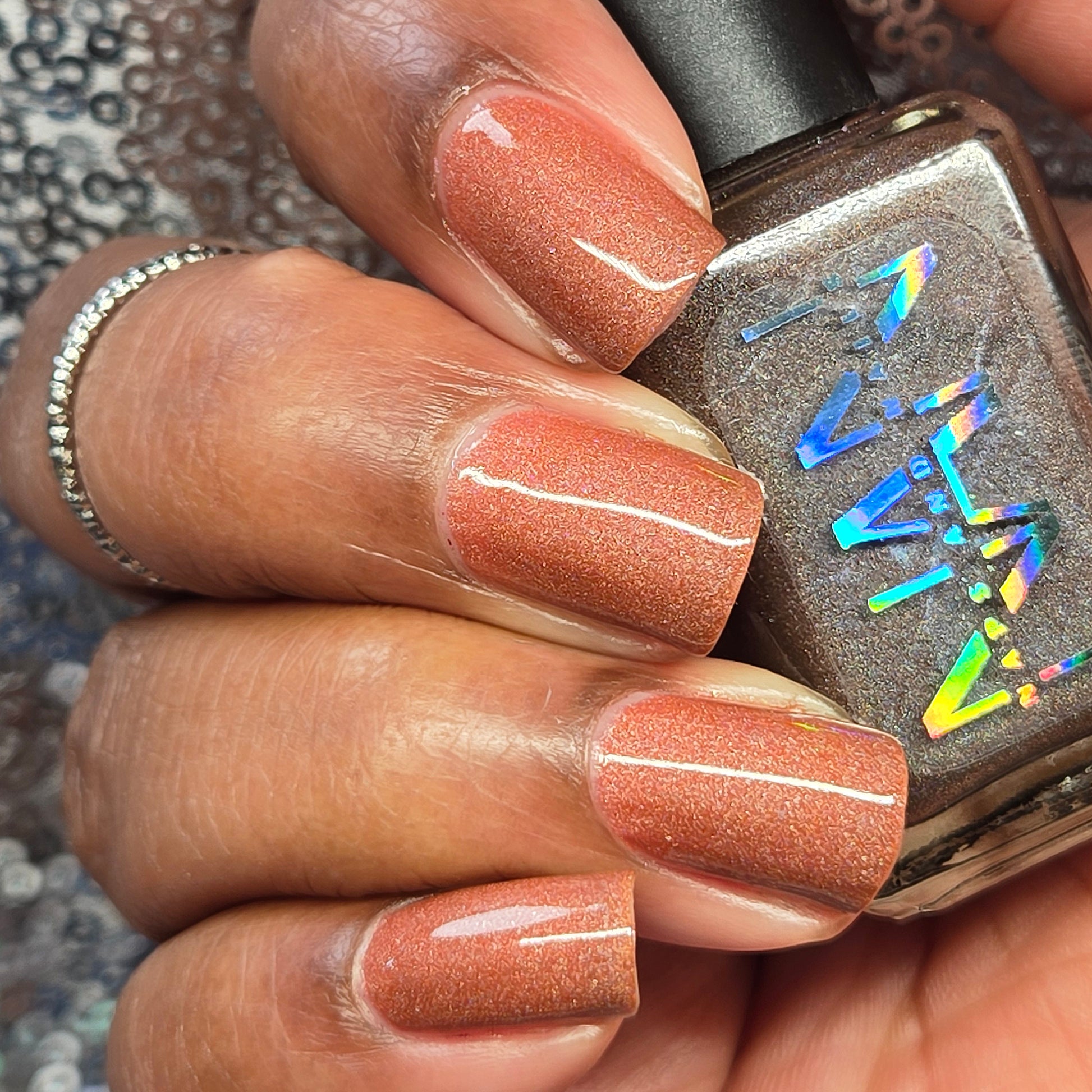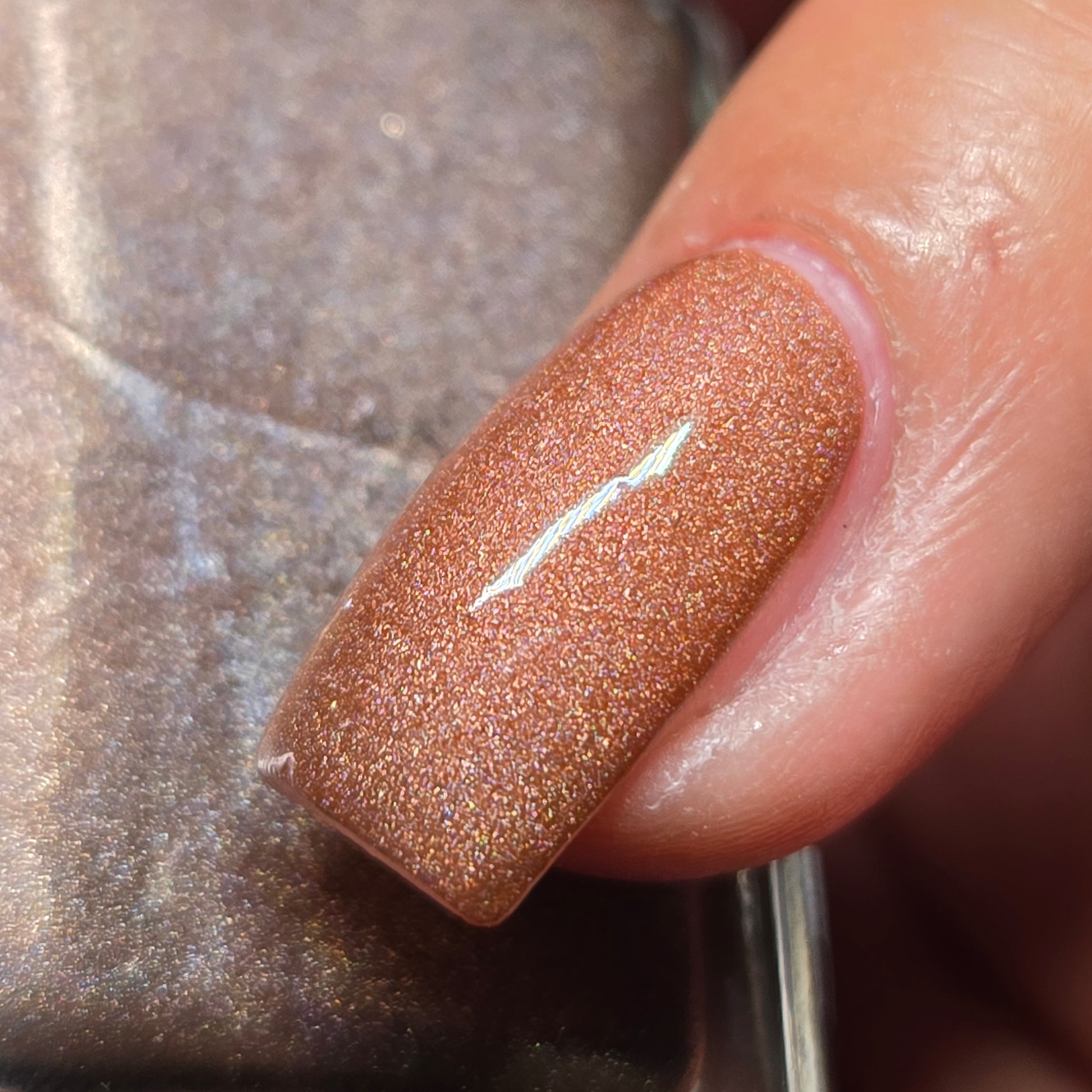 This thermal polish has a pink/red tone when warm to a rusty black when cold and some added holo.
