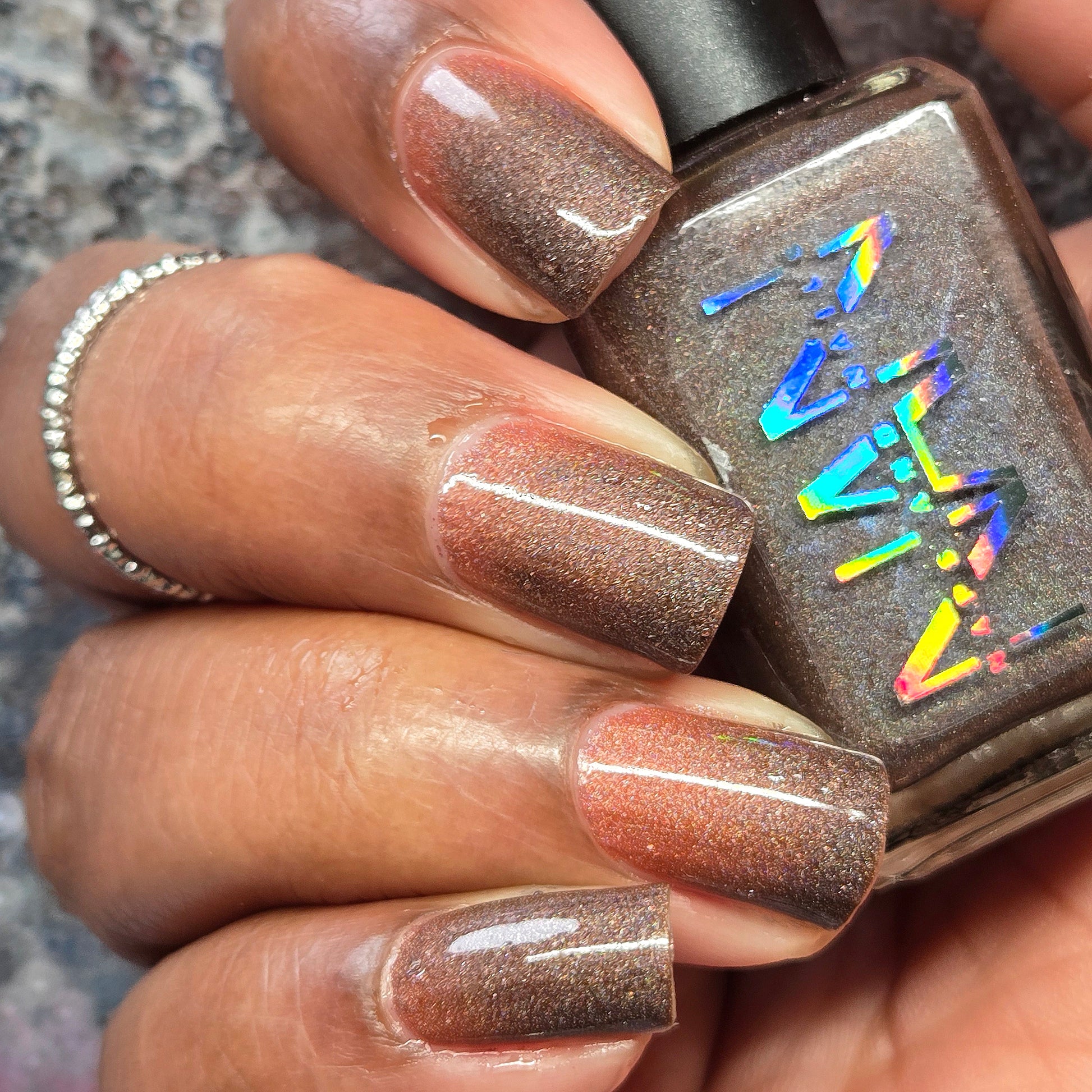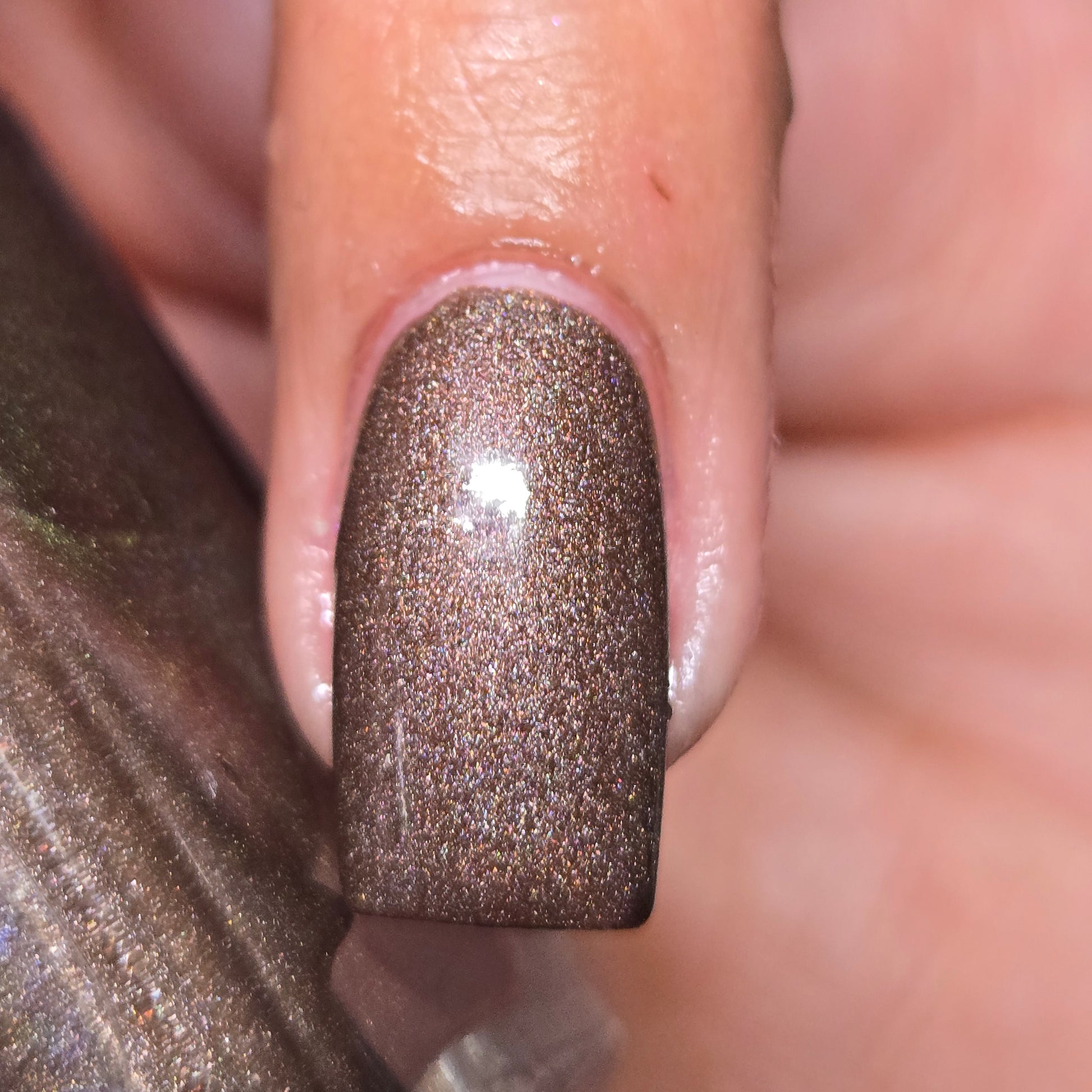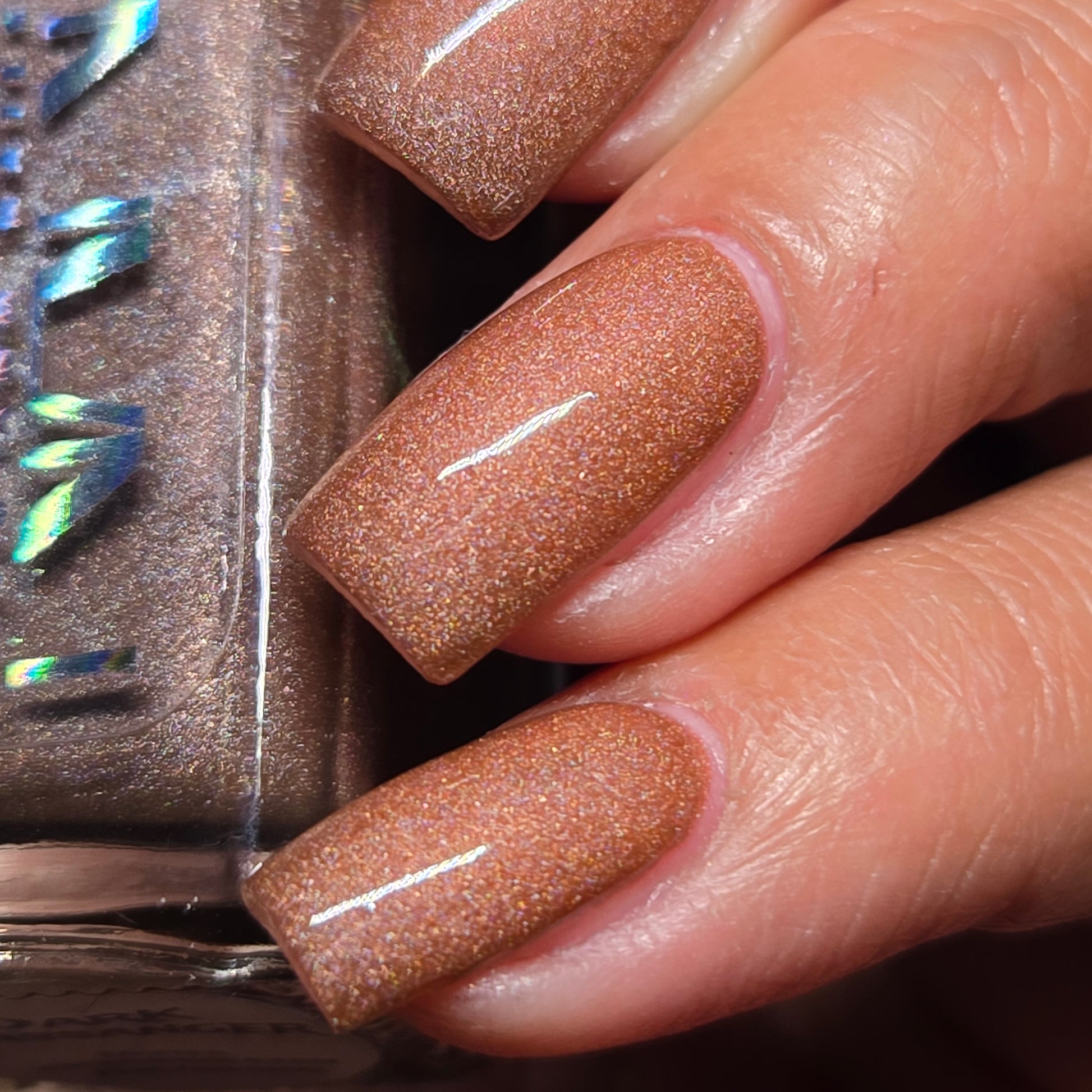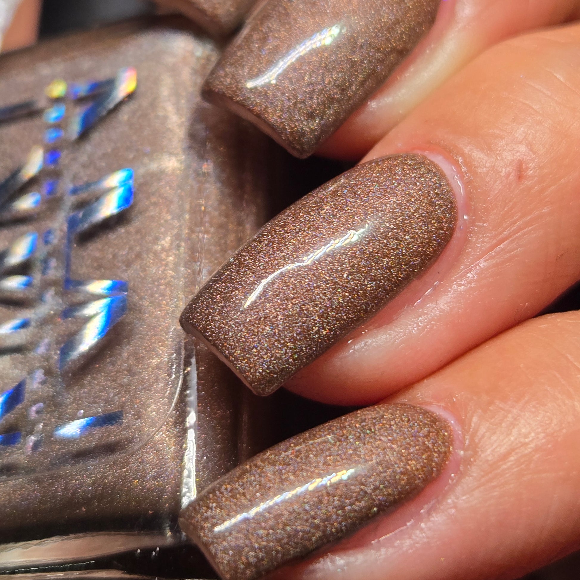 This thermal polish has a pink/red tone when warm to a rusty black when cold and some added holo.