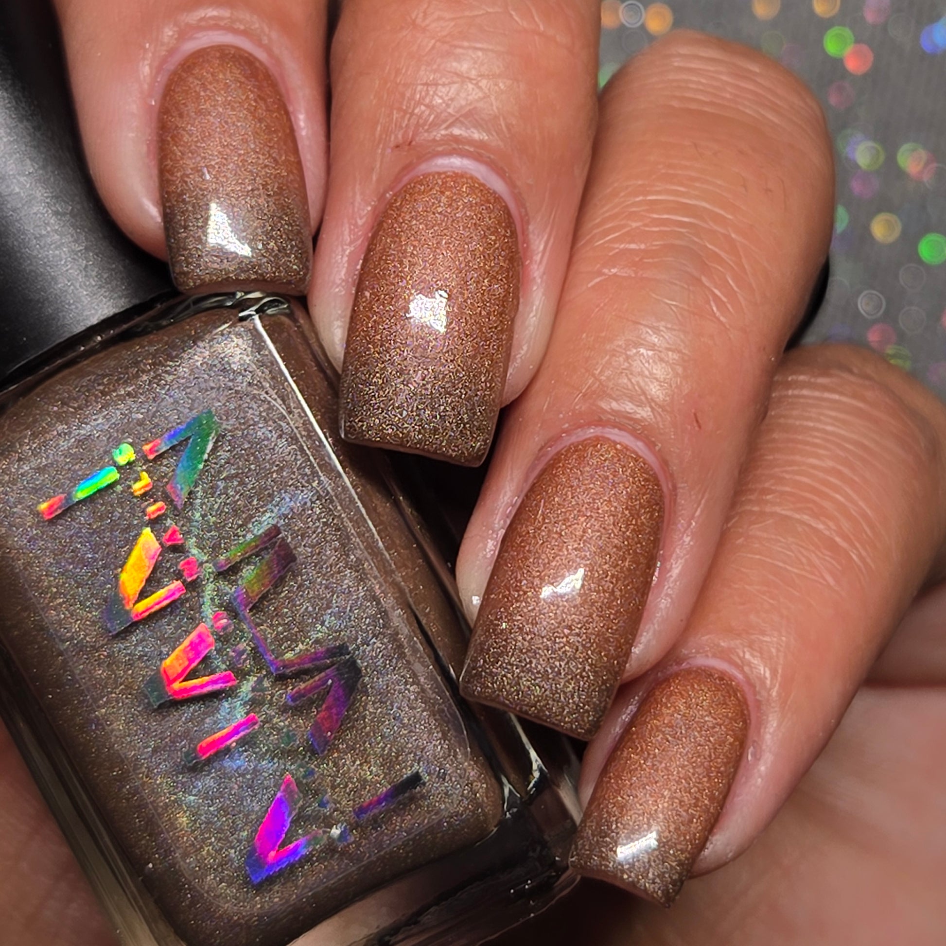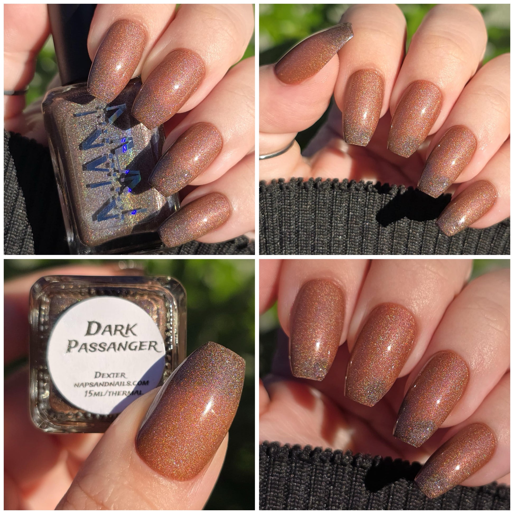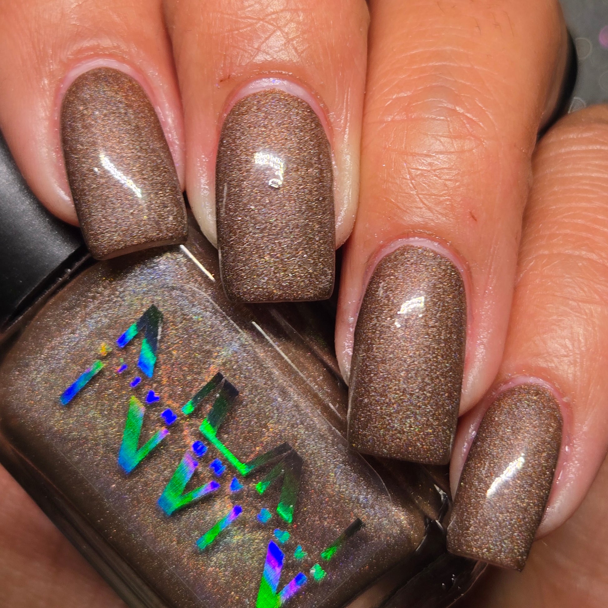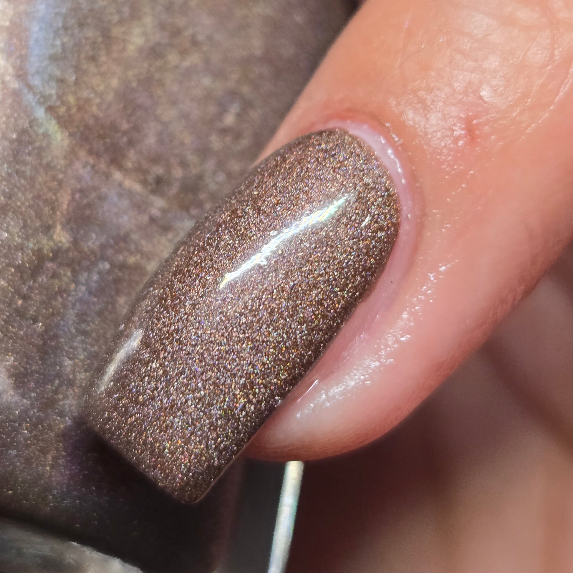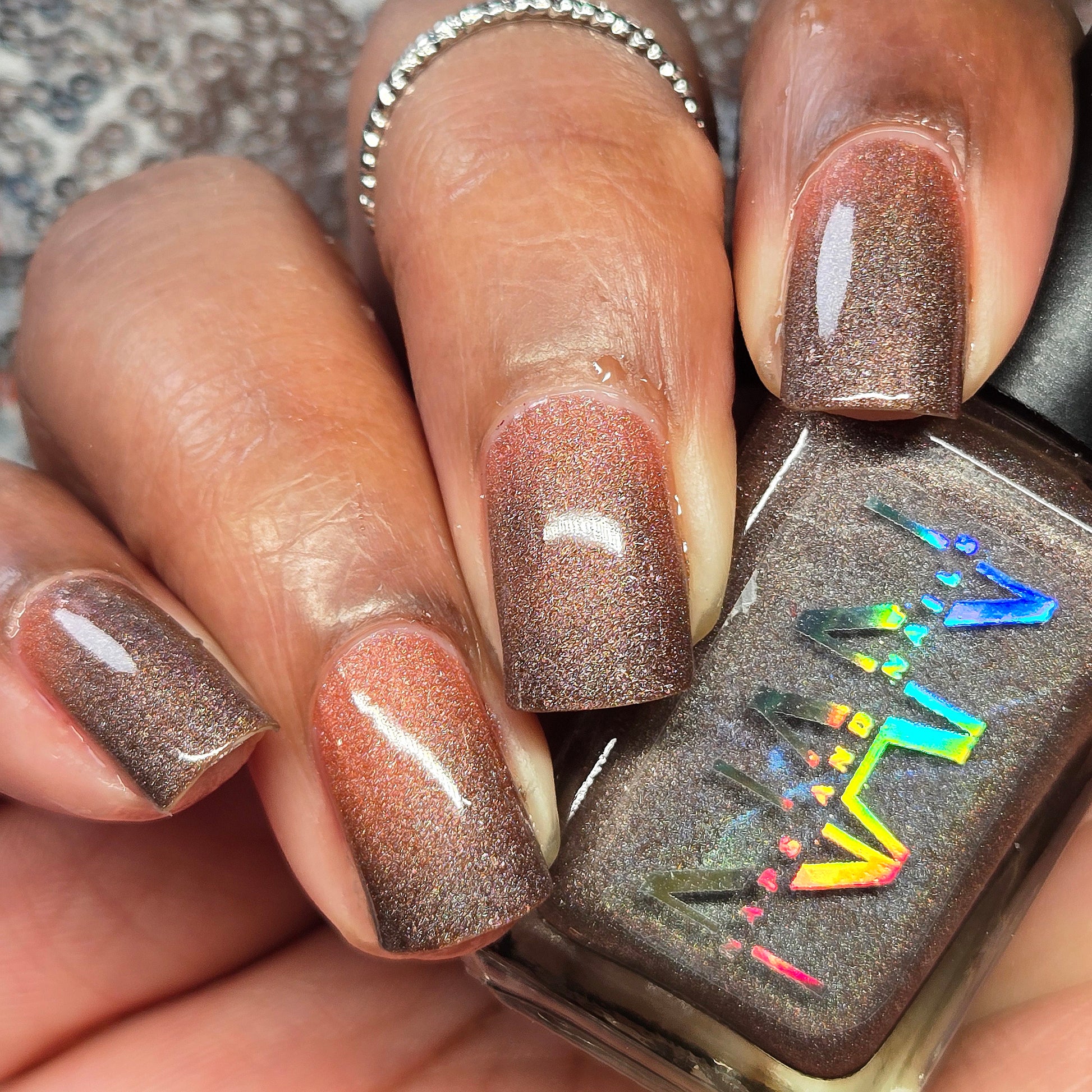 This thermal polish has a pink/red tone when warm to a rusty black when cold and some added holo.