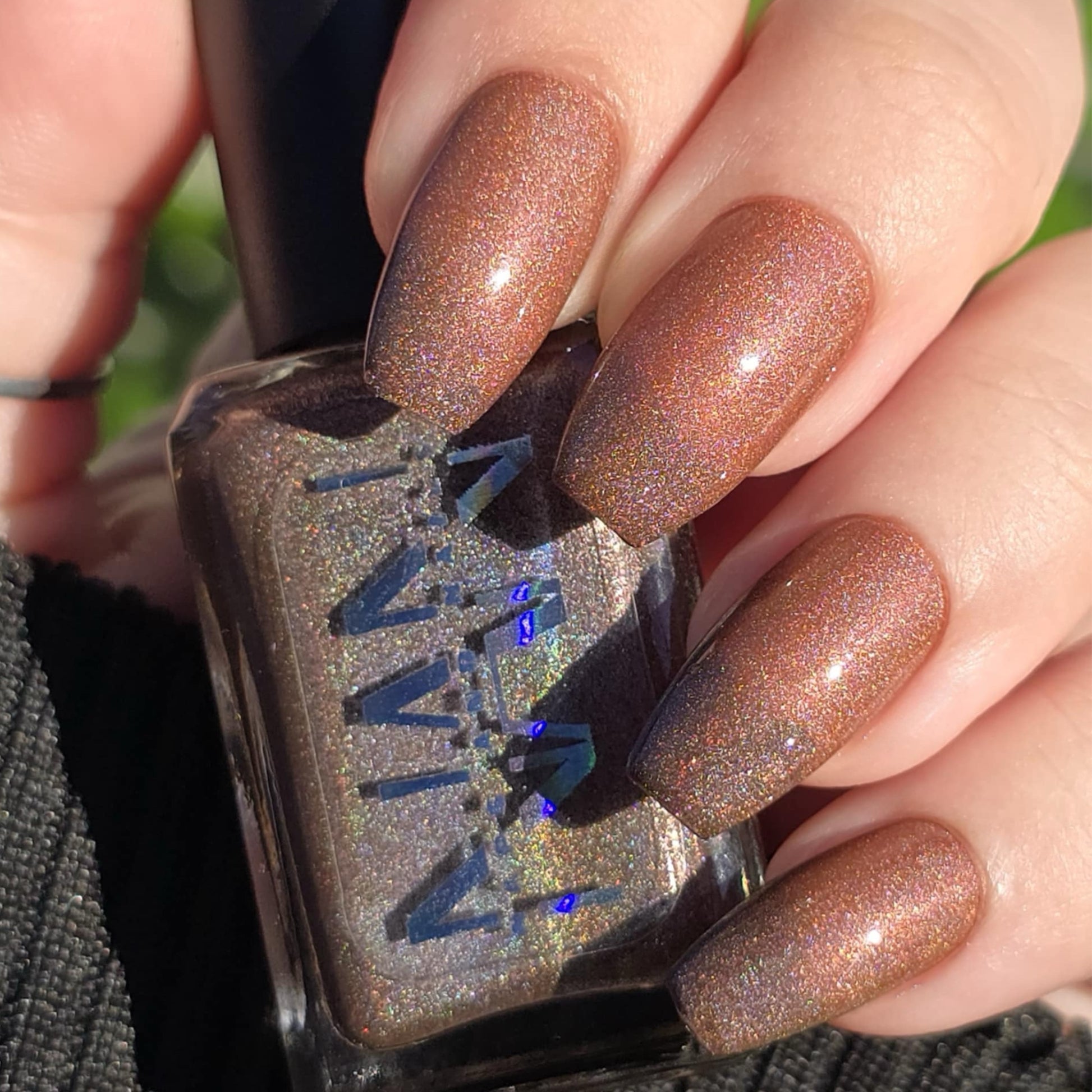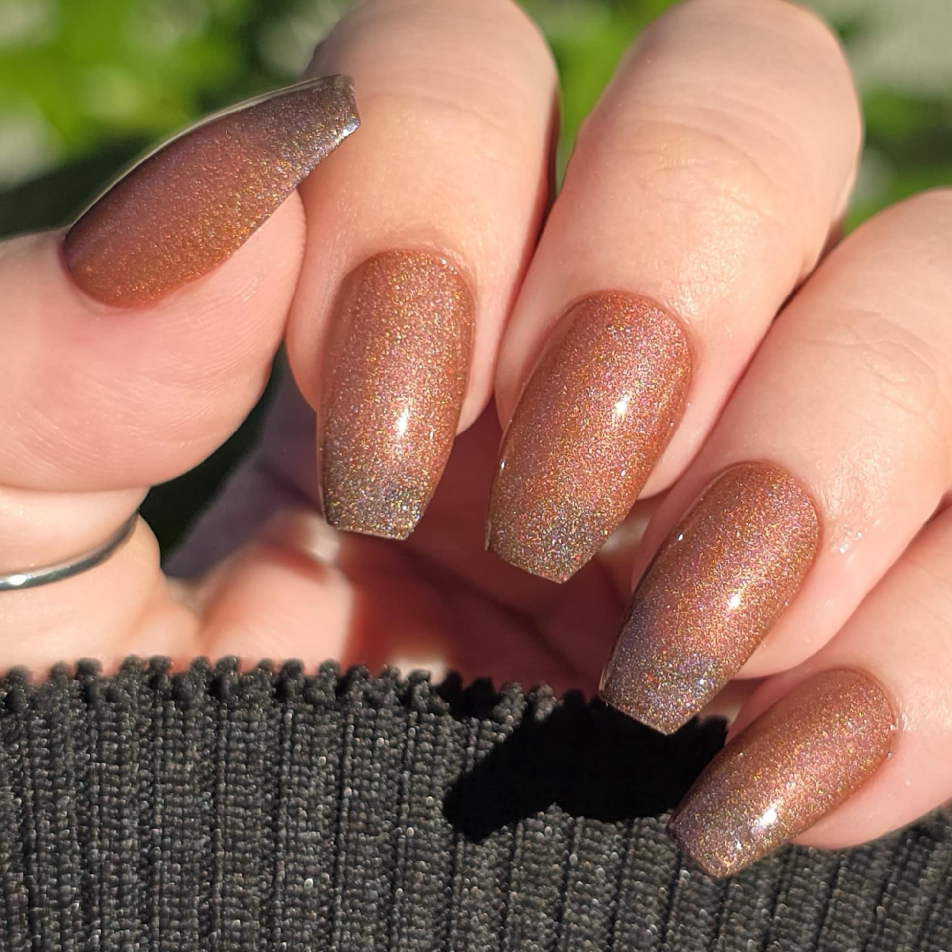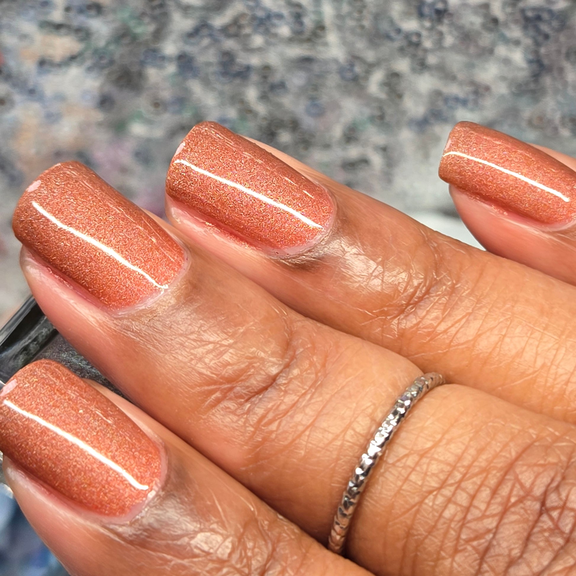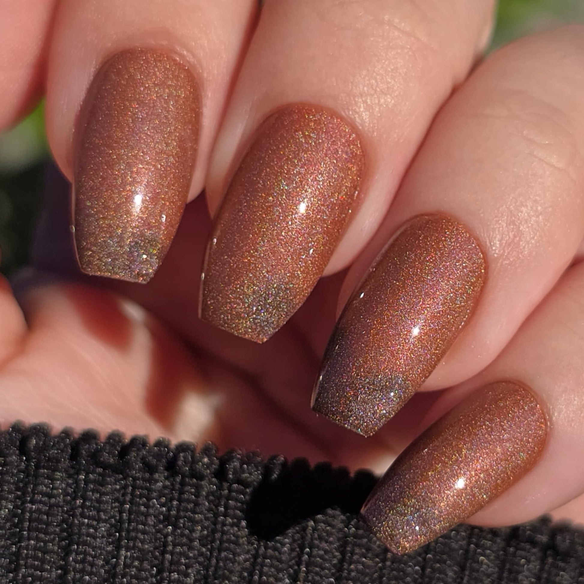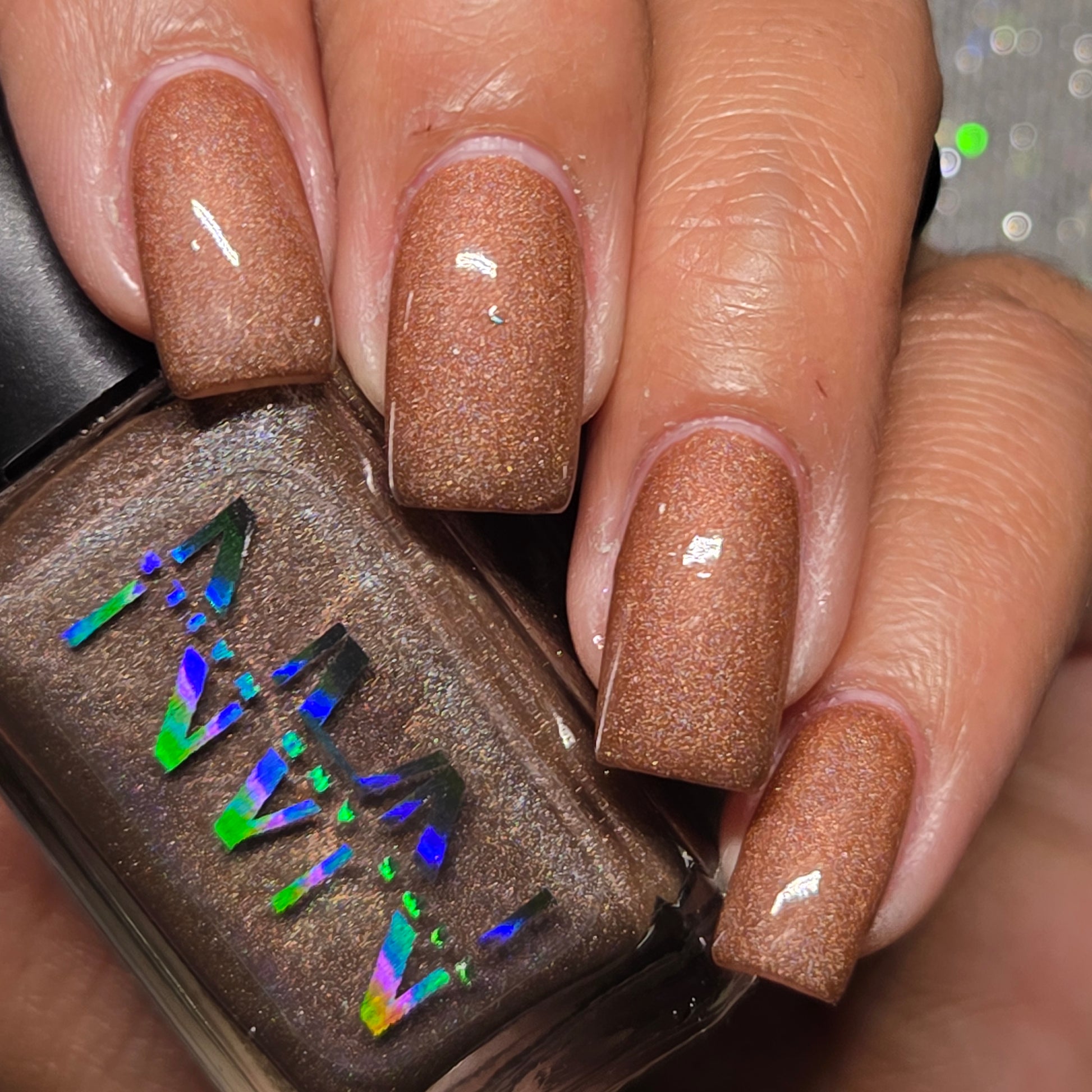 This thermal polish has a pink/red tone when warm to a rusty black when cold and some added holo.