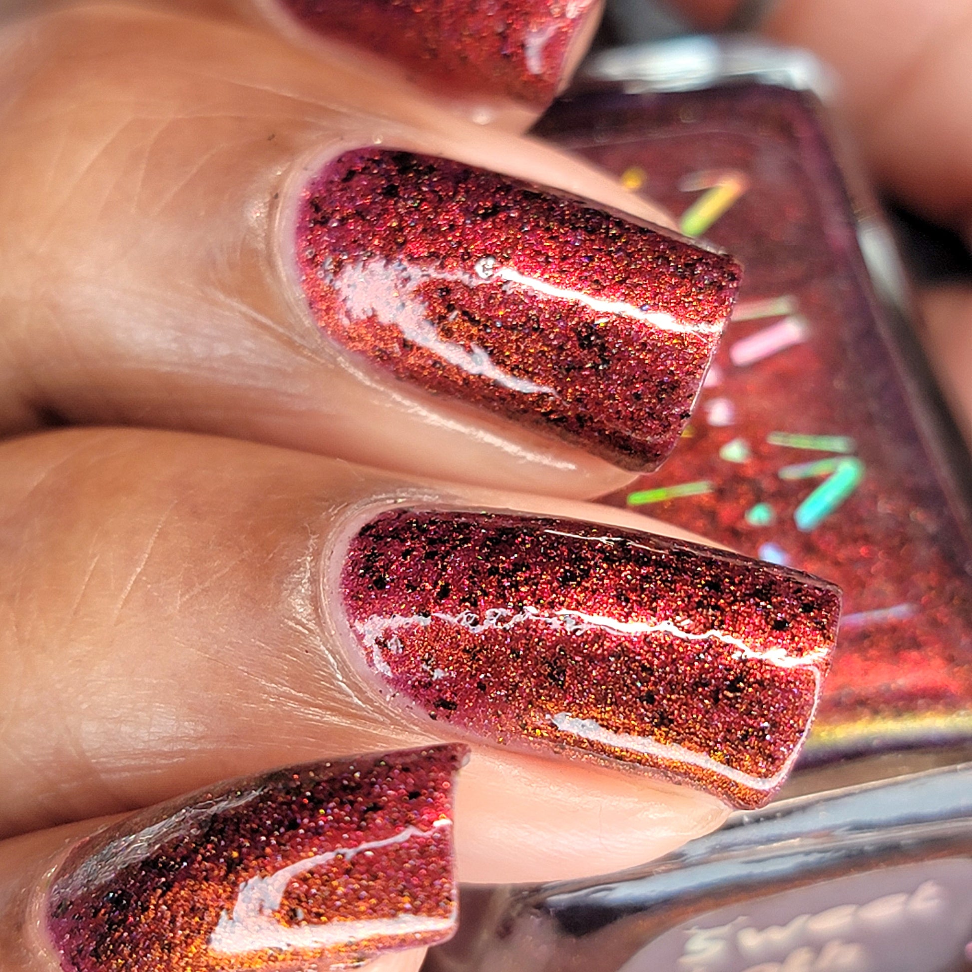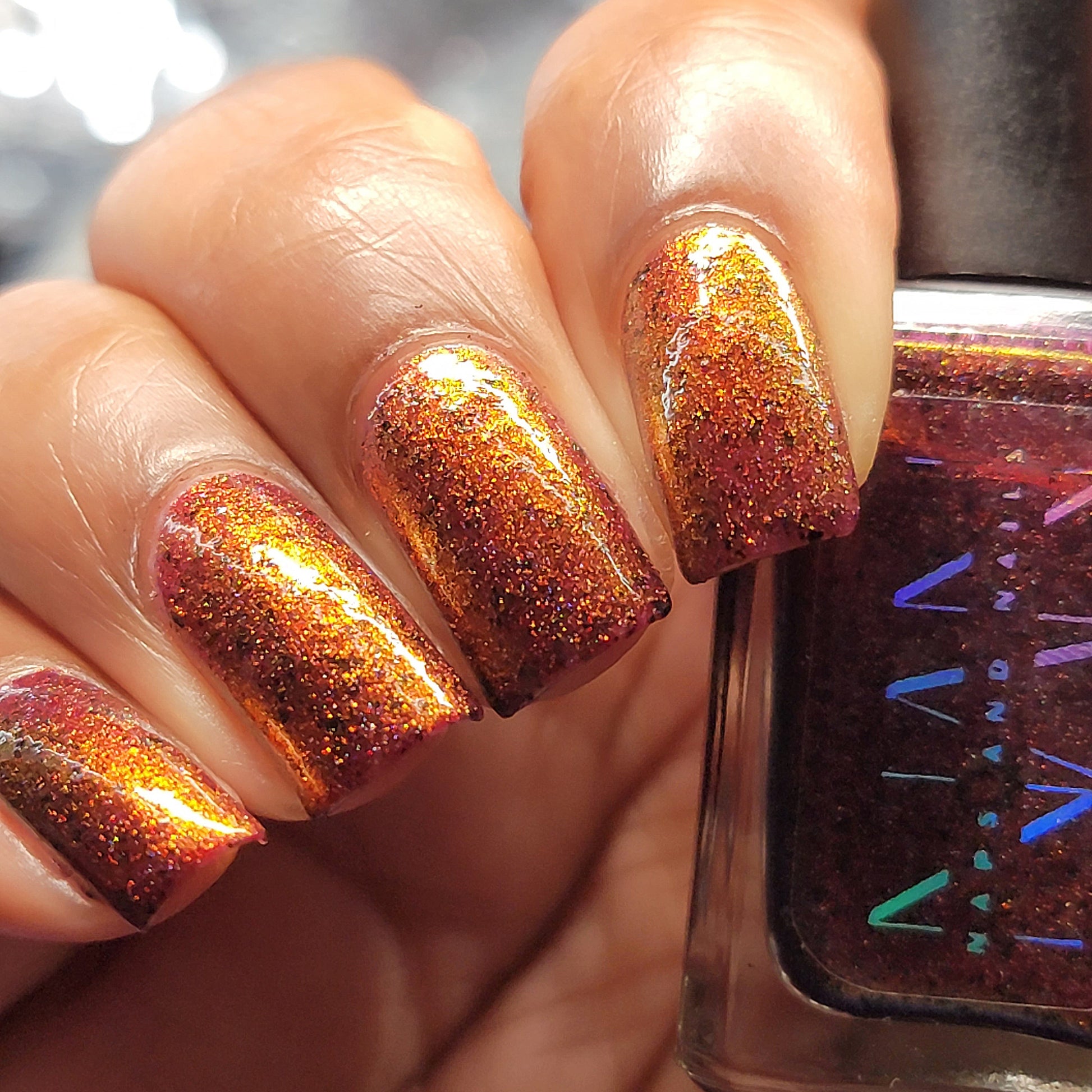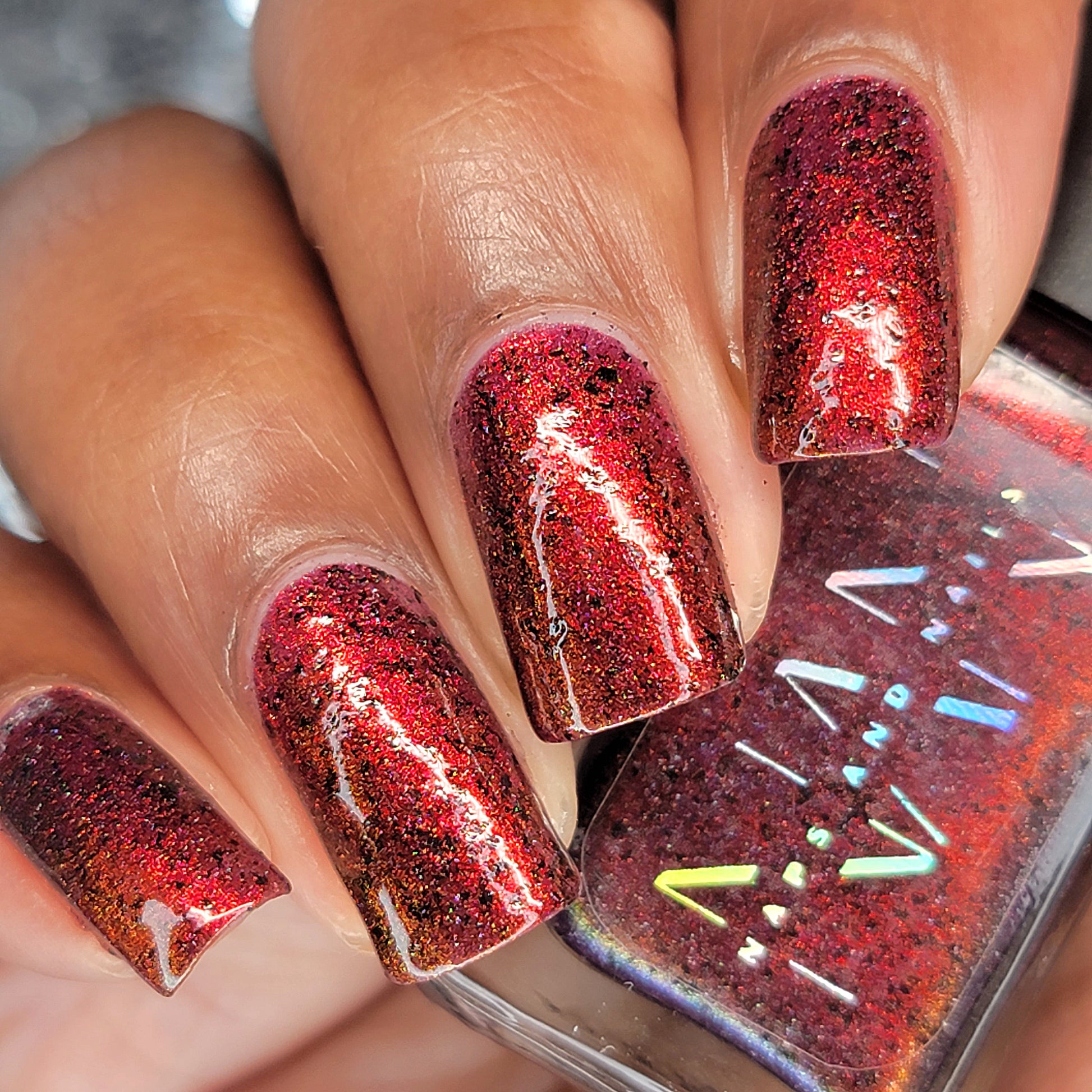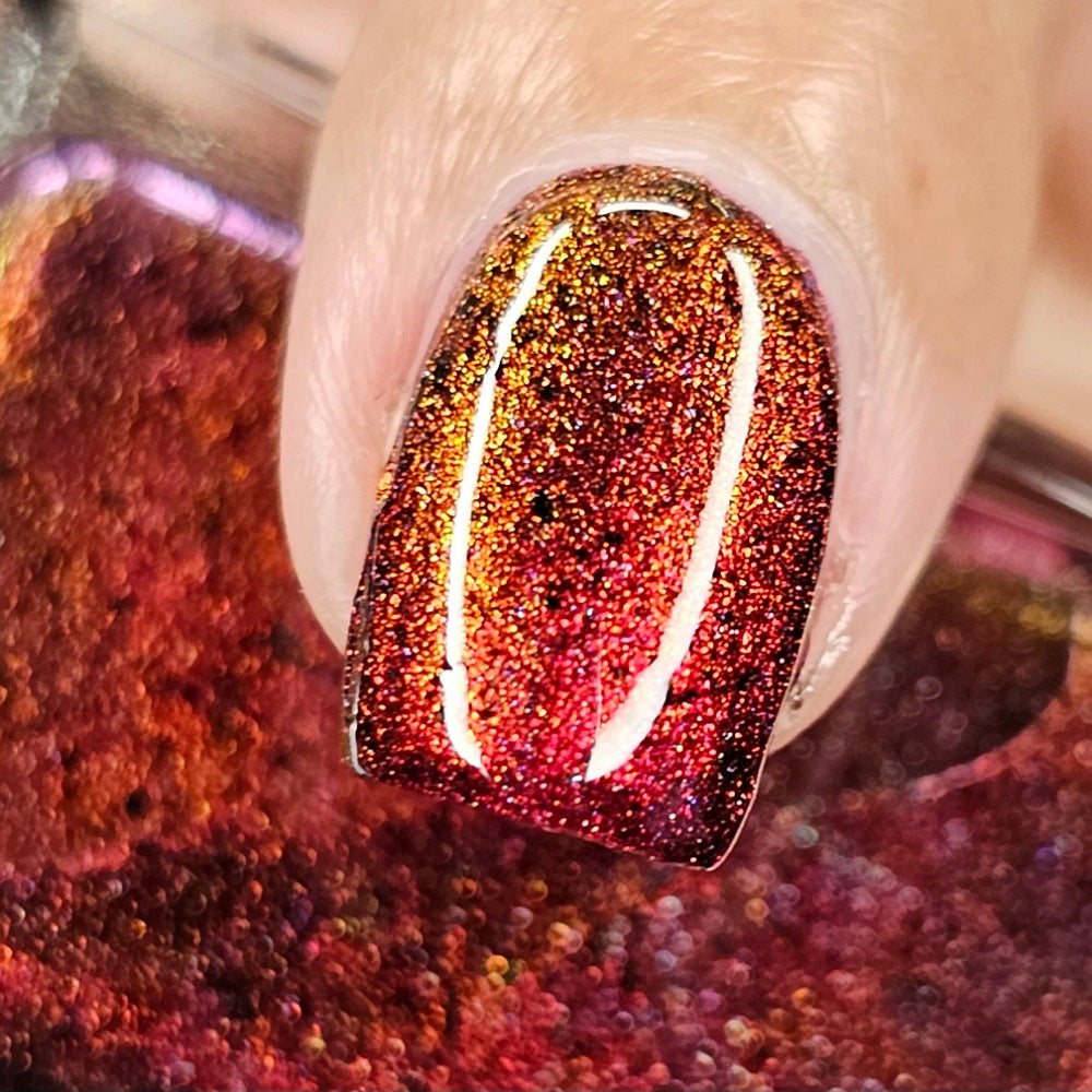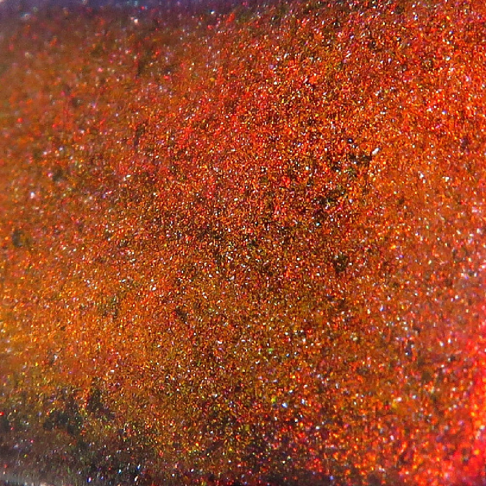 A red based holo with a strong red/gold/copper shift and black metallic flakes