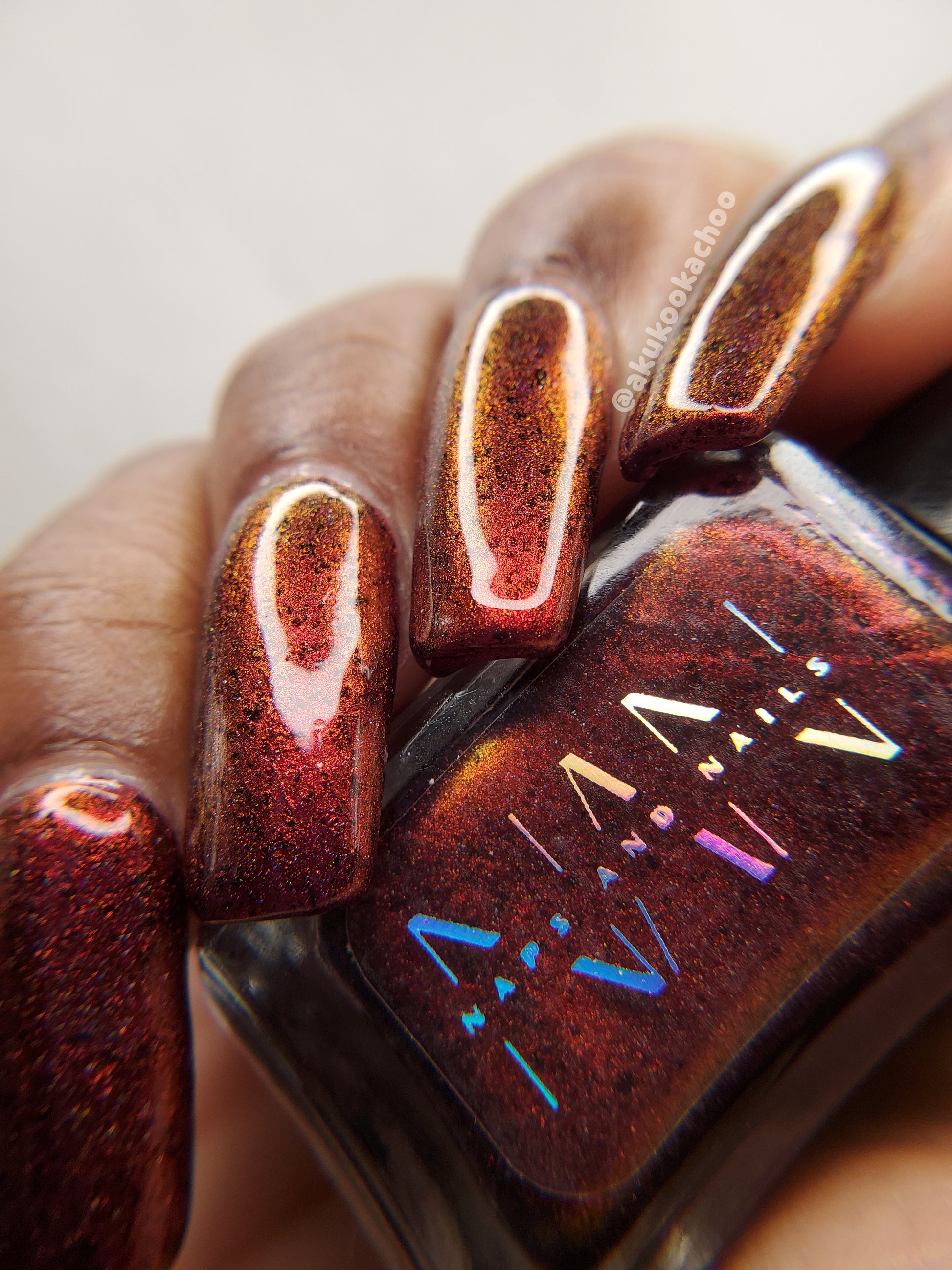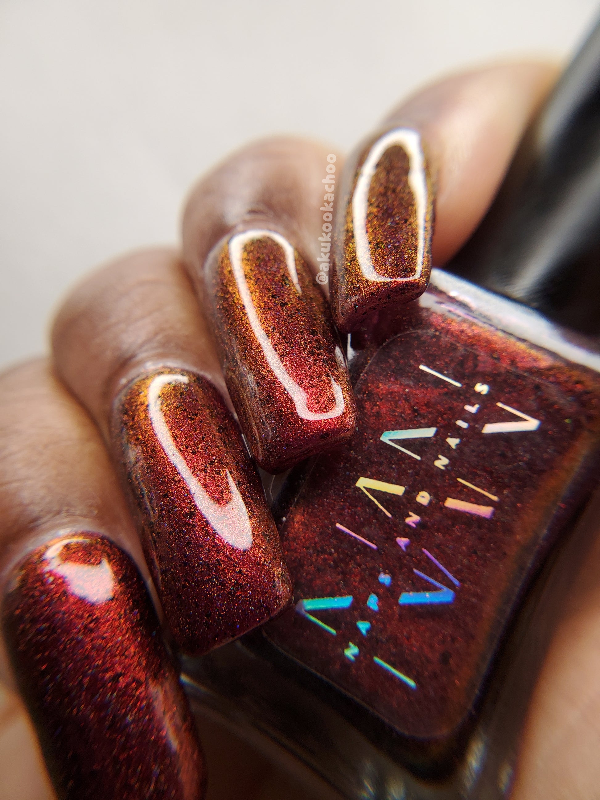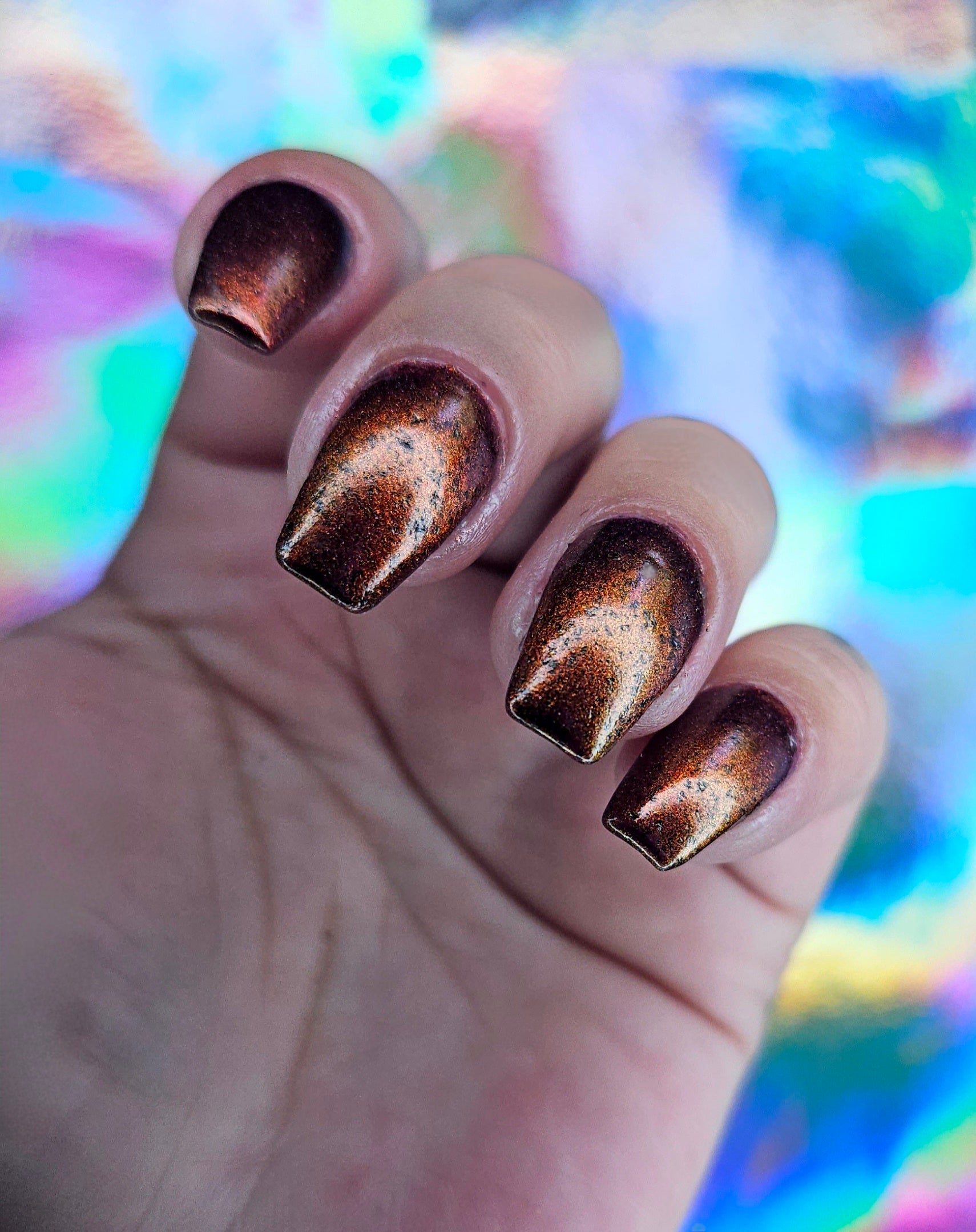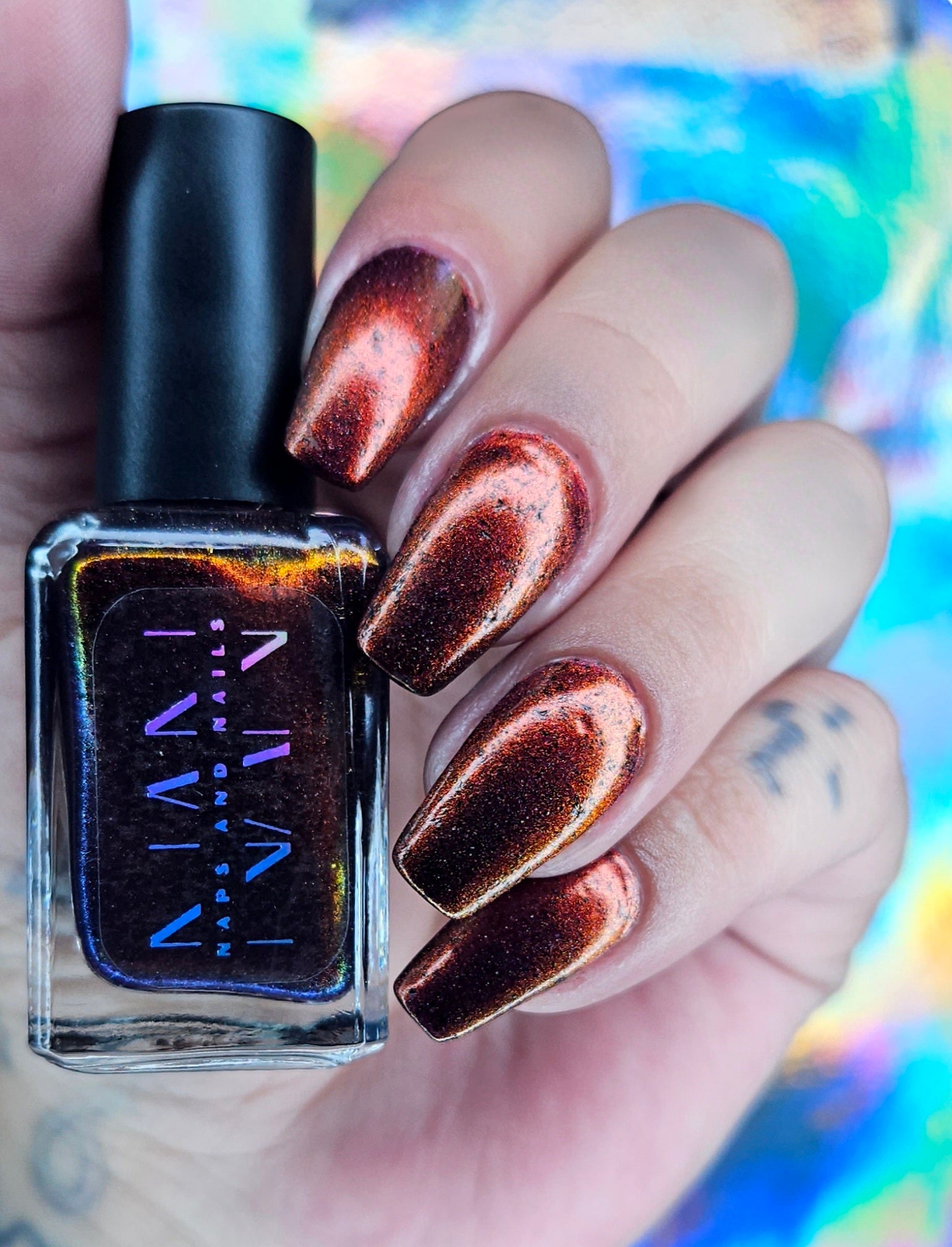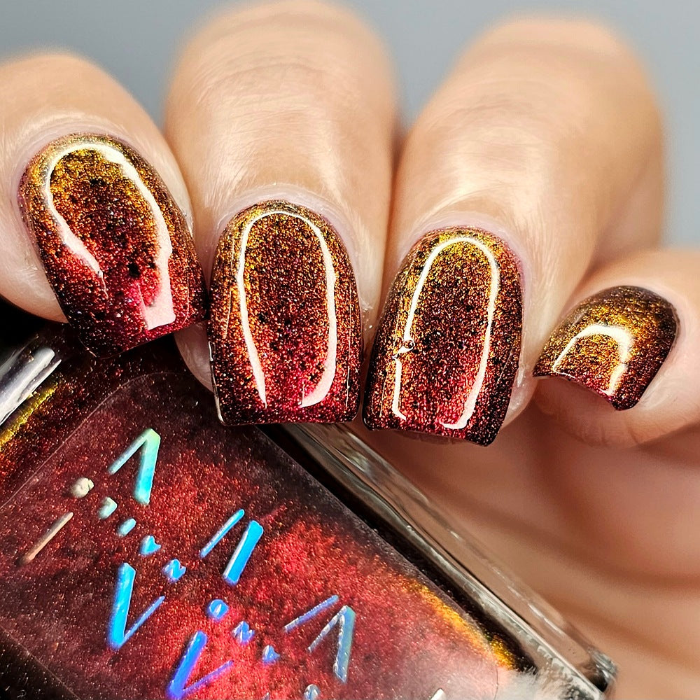 A red based holo with a strong red/gold/copper shift and black metallic flakes