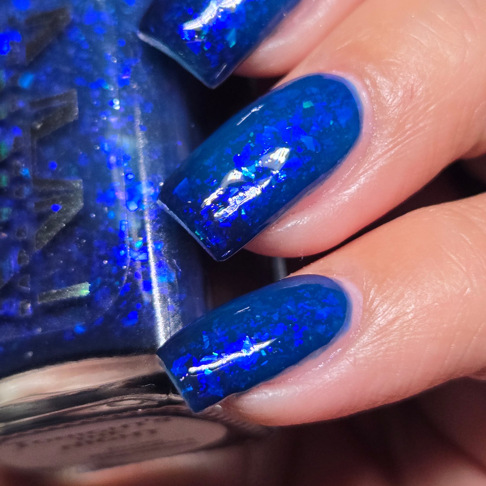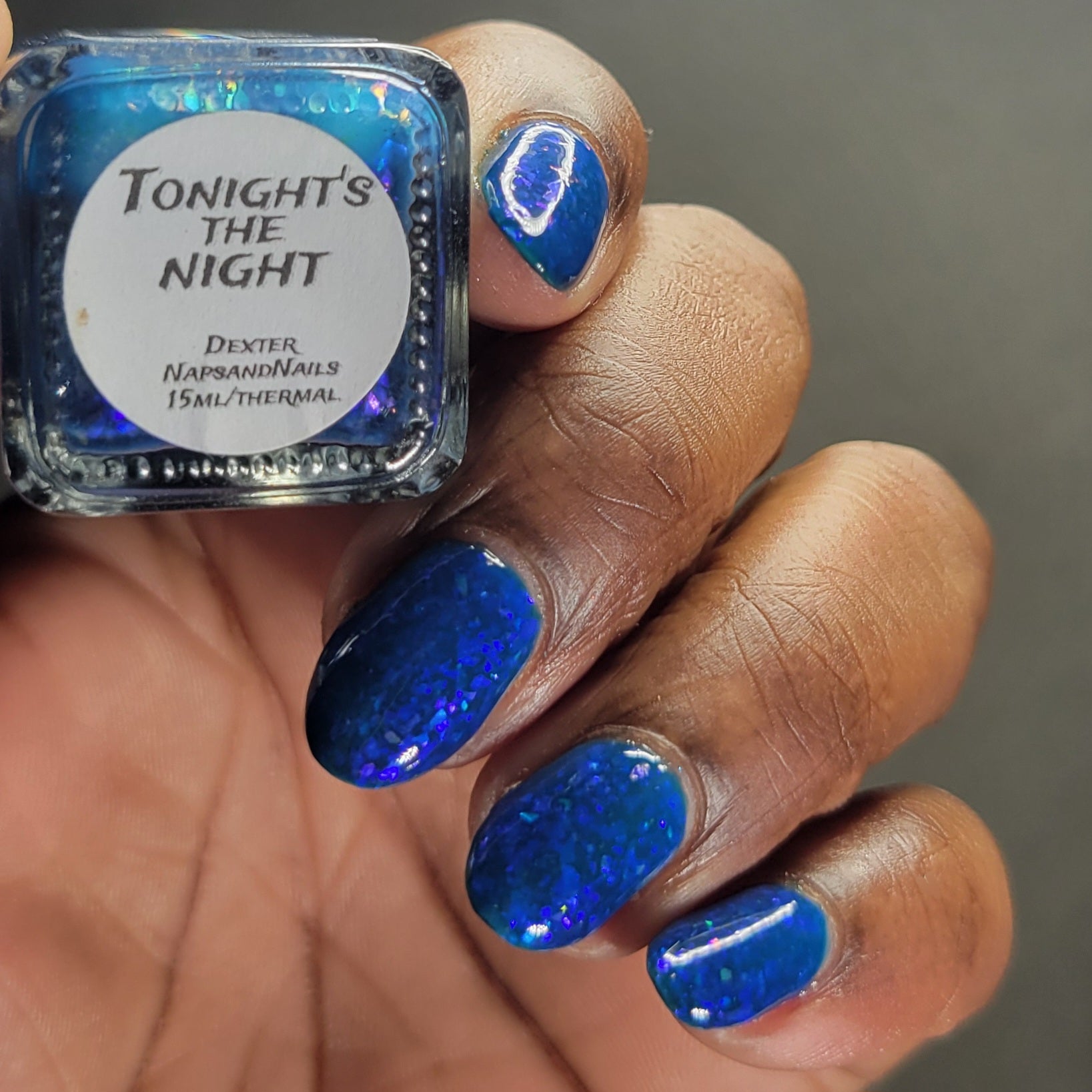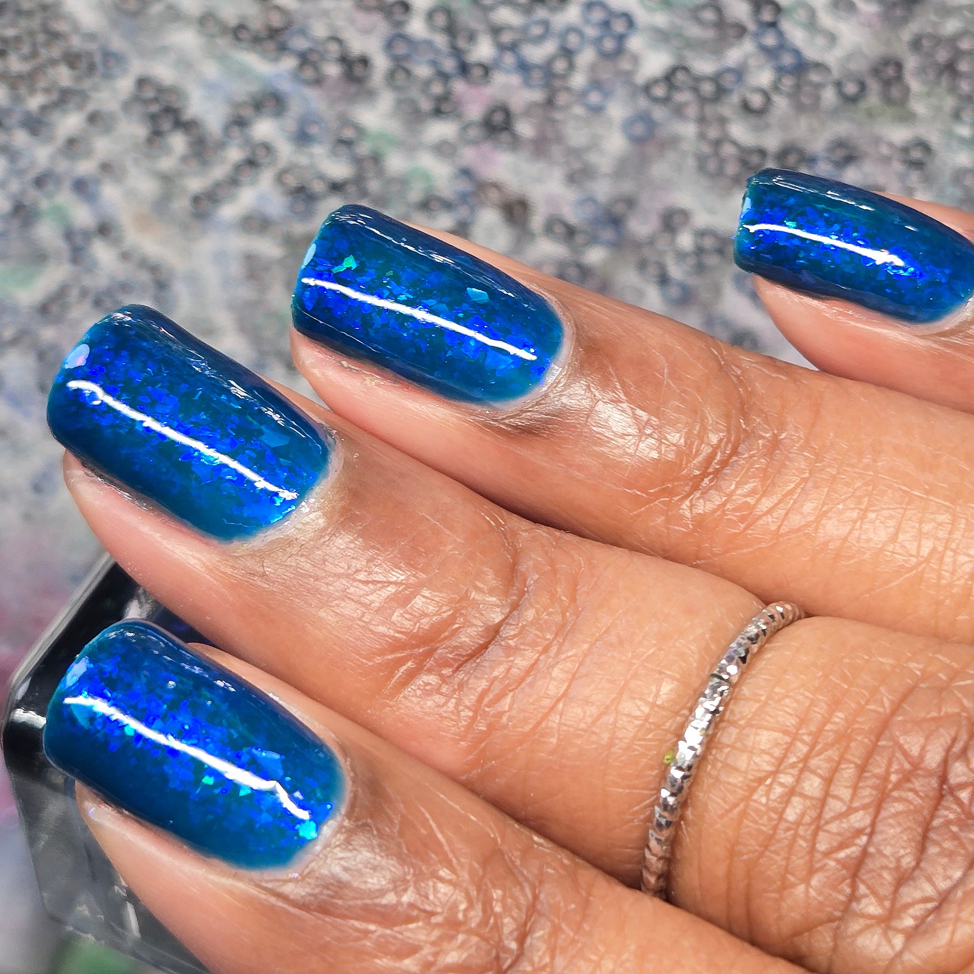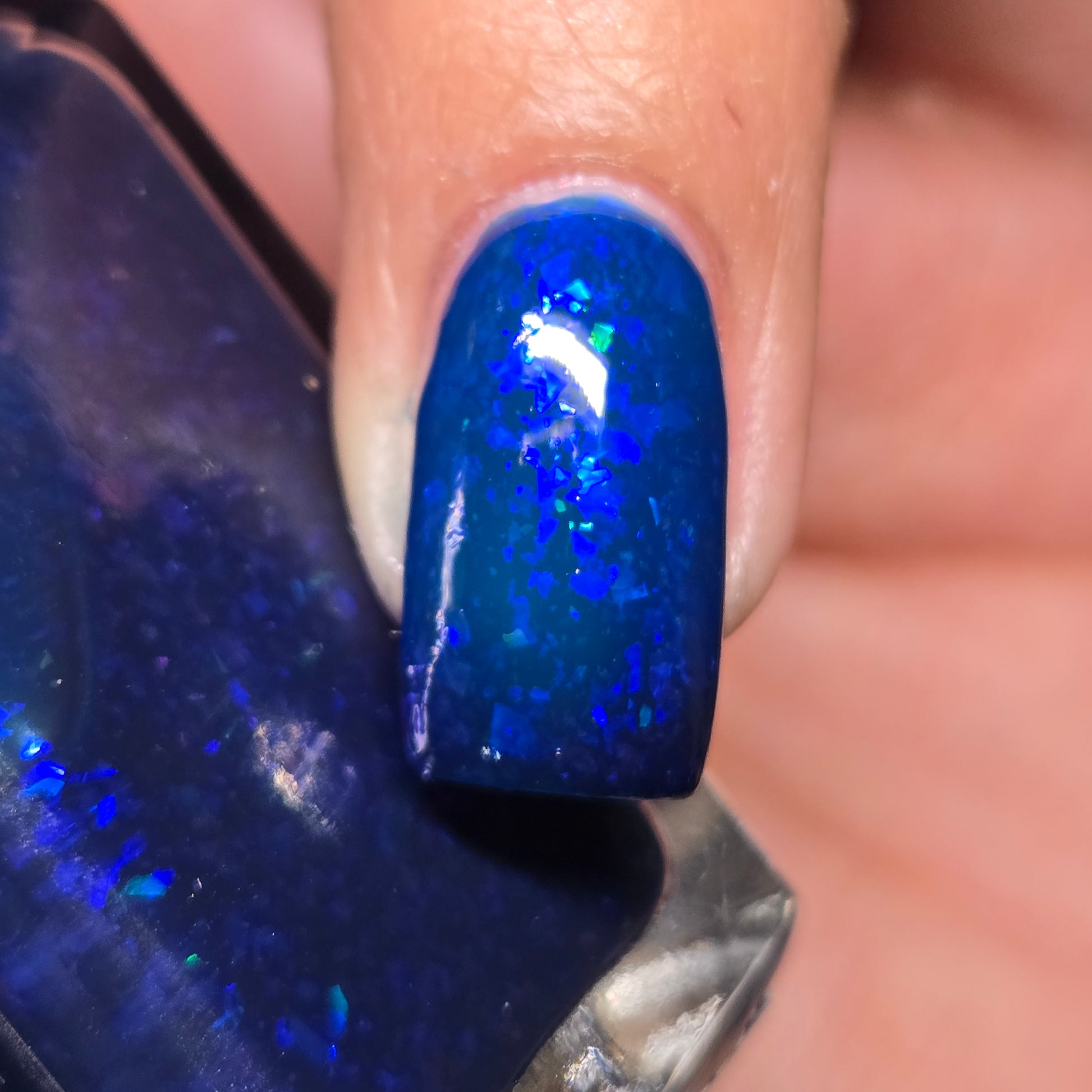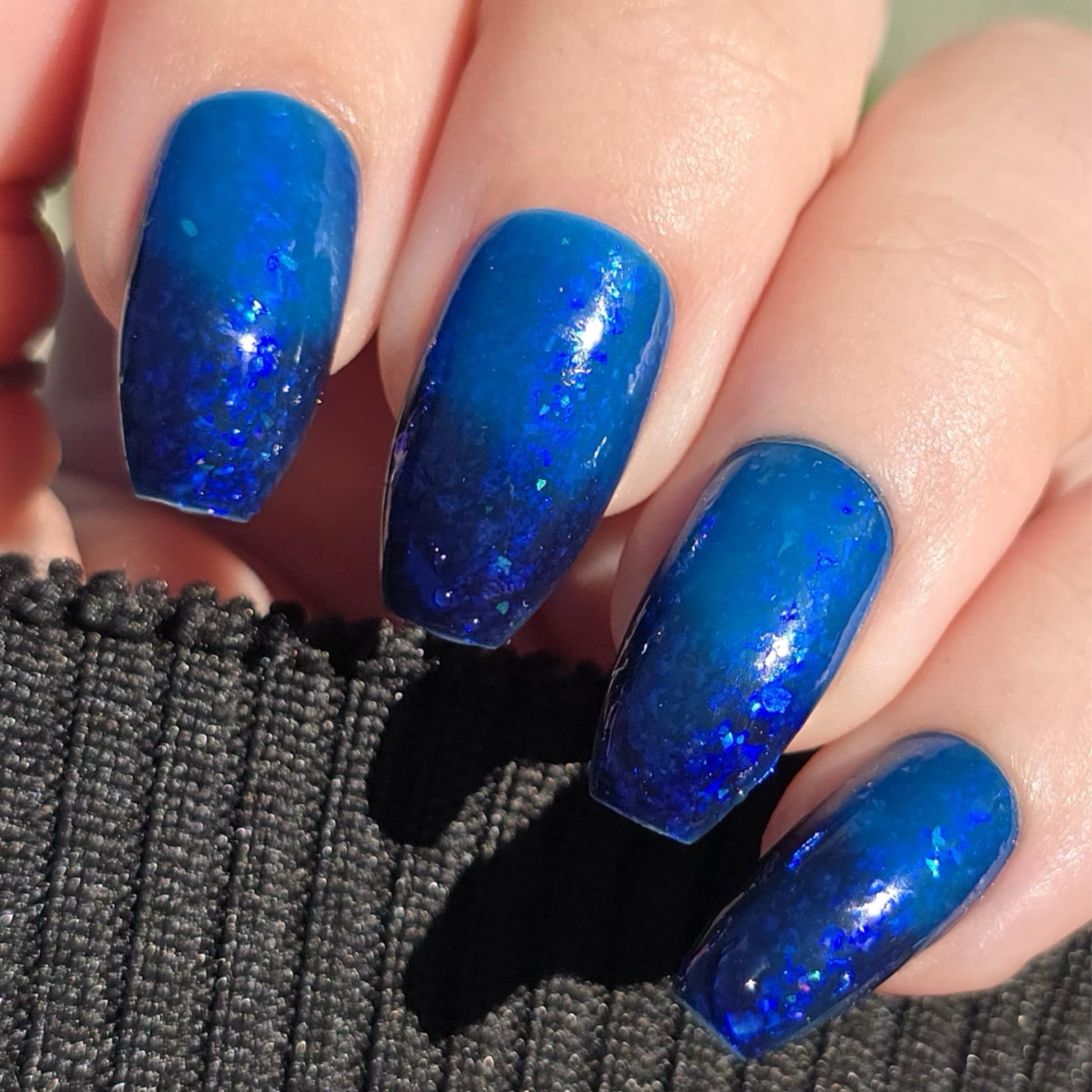 This thermal polish has a blue tone when warm to deep blue black when cold thermal with blue/purple shifting iridescent flakes.