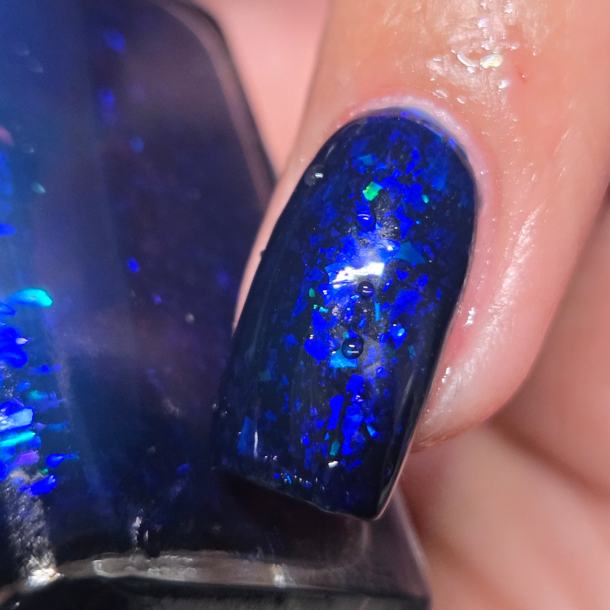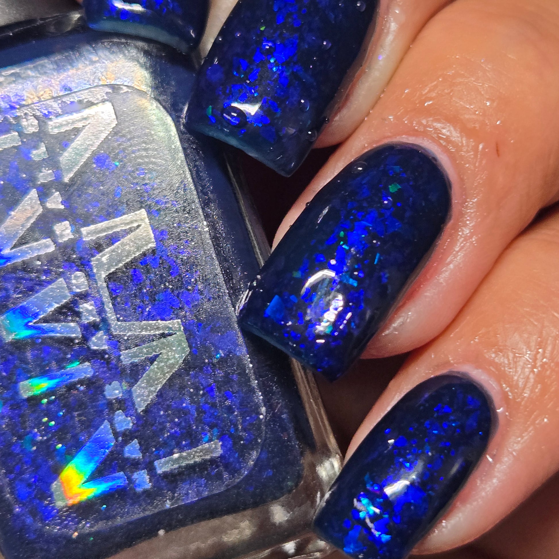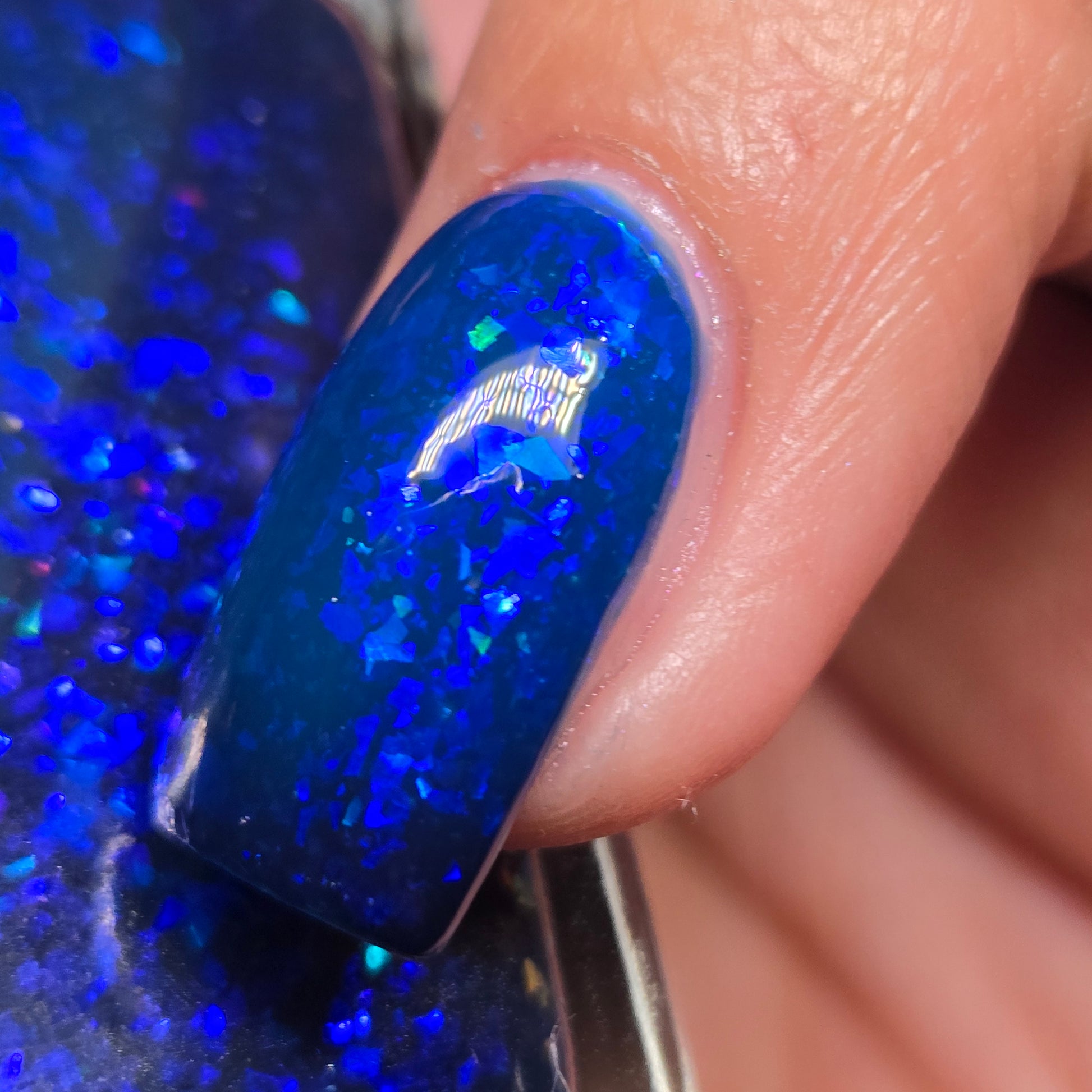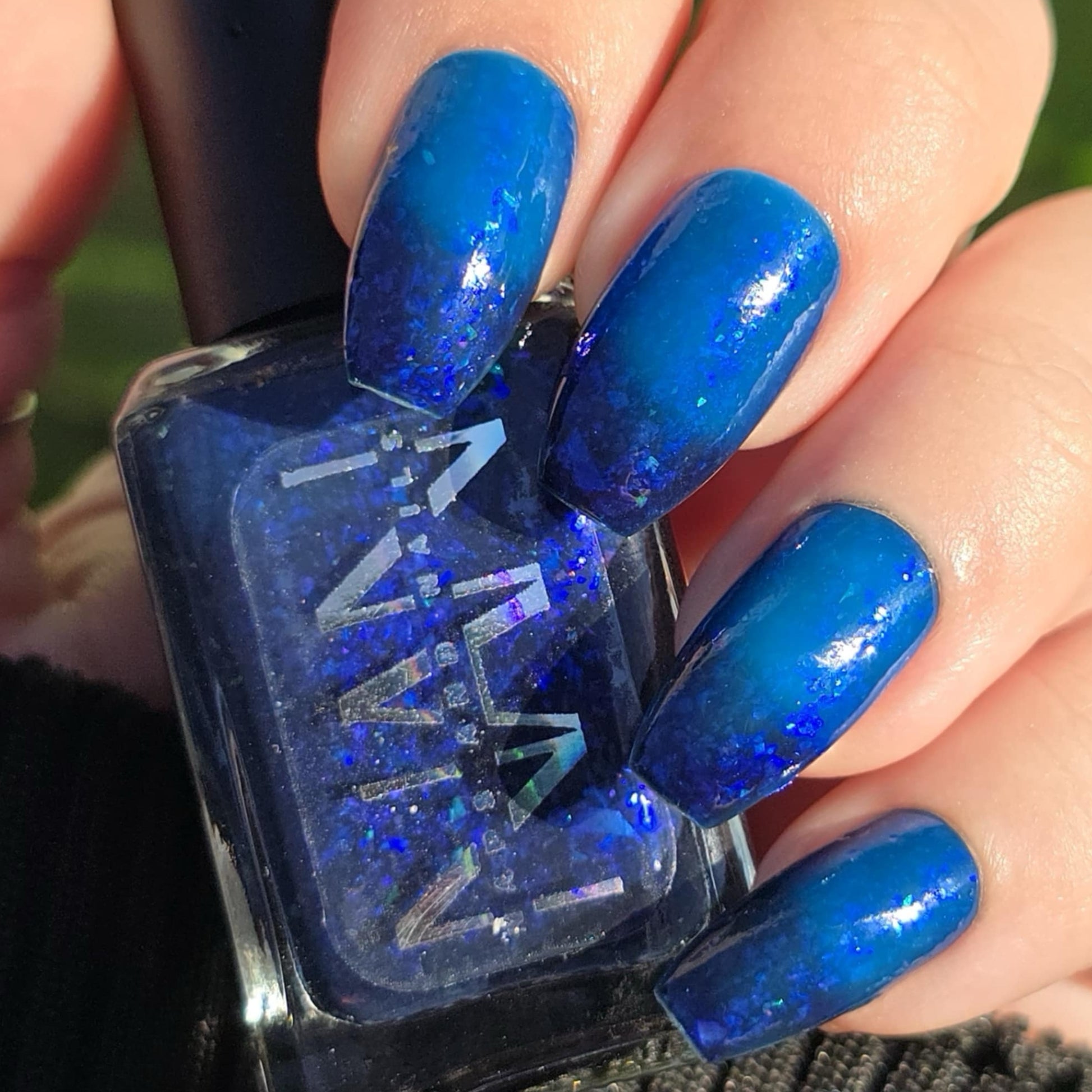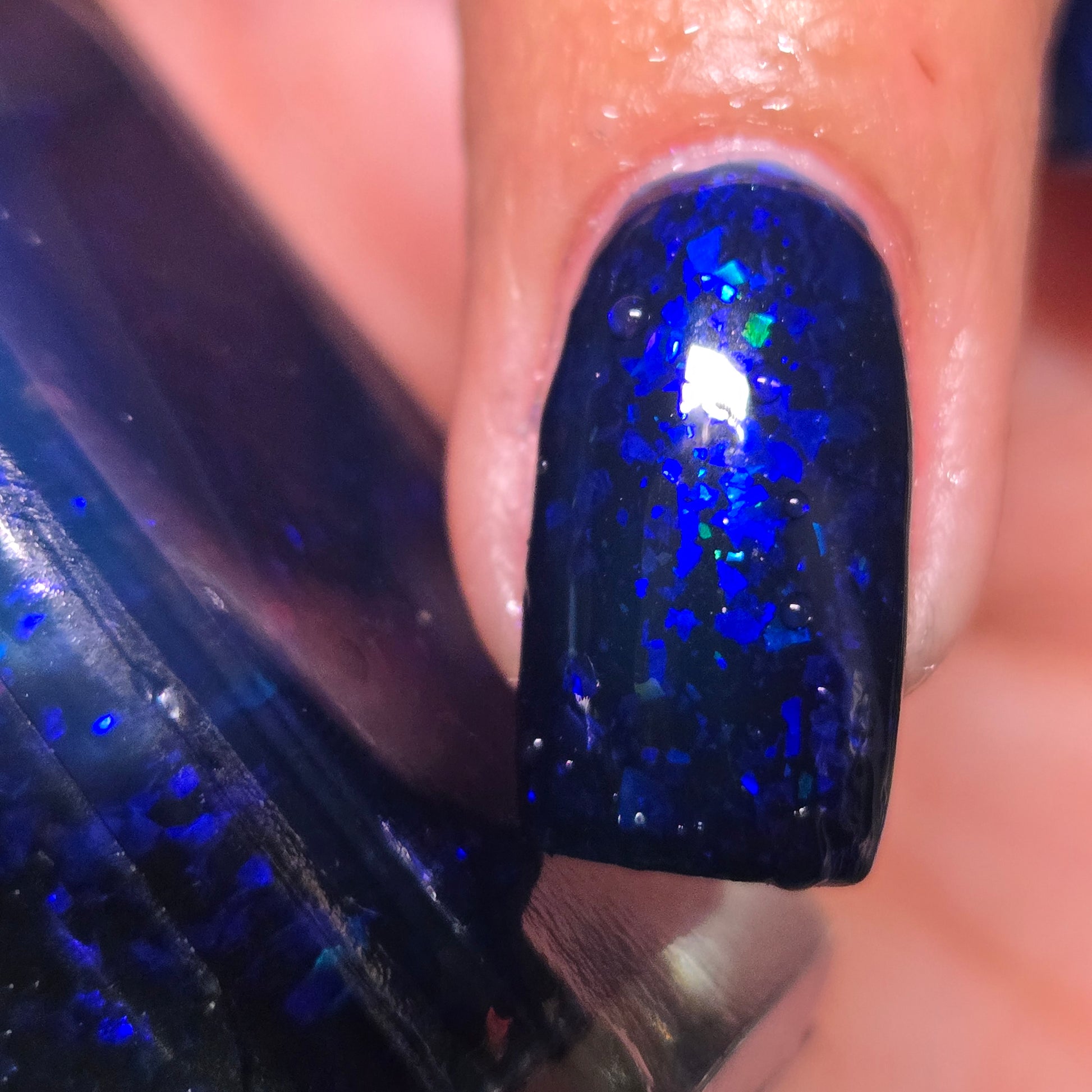 This thermal polish has a blue tone when warm to deep blue black when cold thermal with blue/purple shifting iridescent flakes.