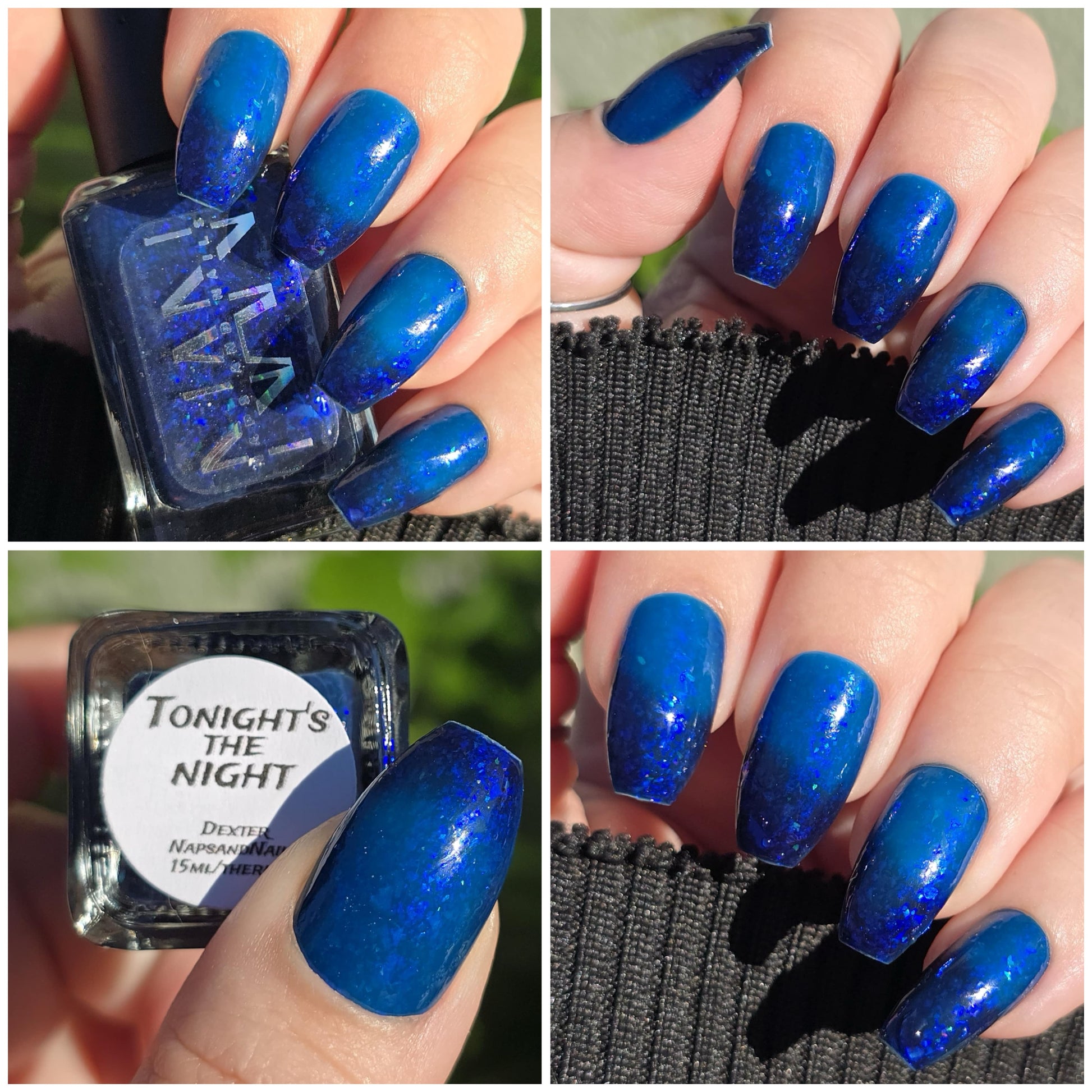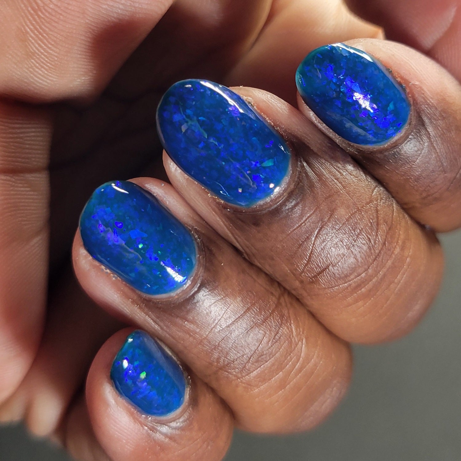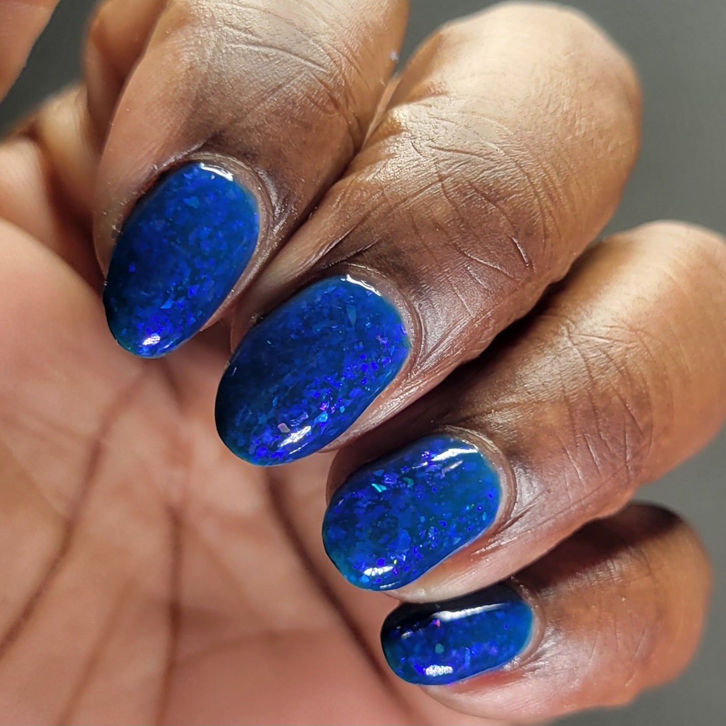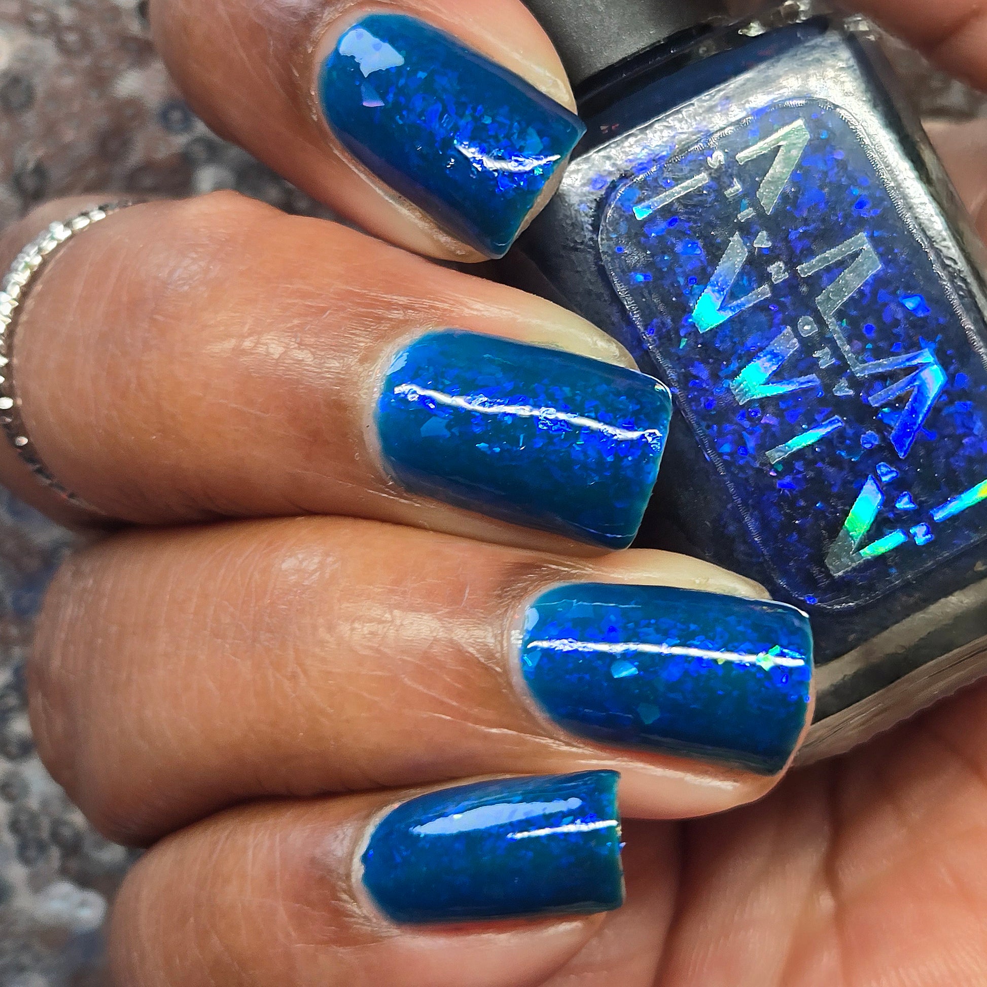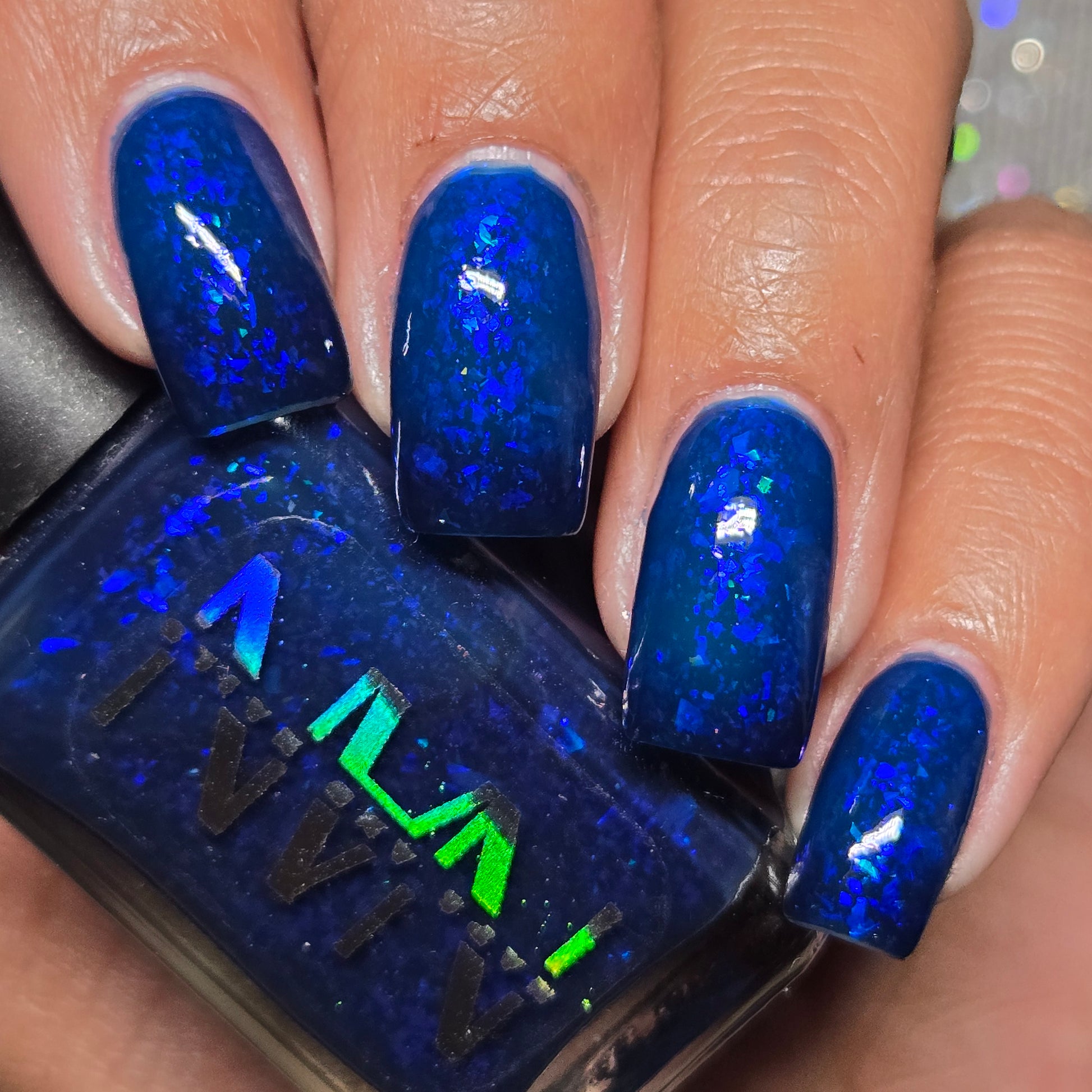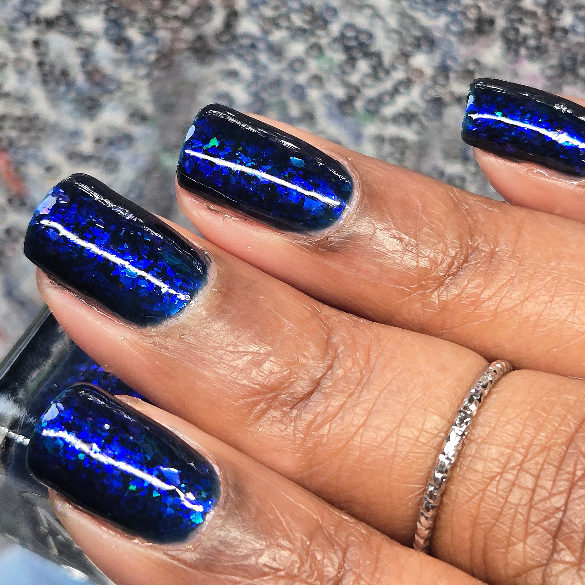 This thermal polish has a blue tone when warm to deep blue black when cold thermal with blue/purple shifting iridescent flakes.