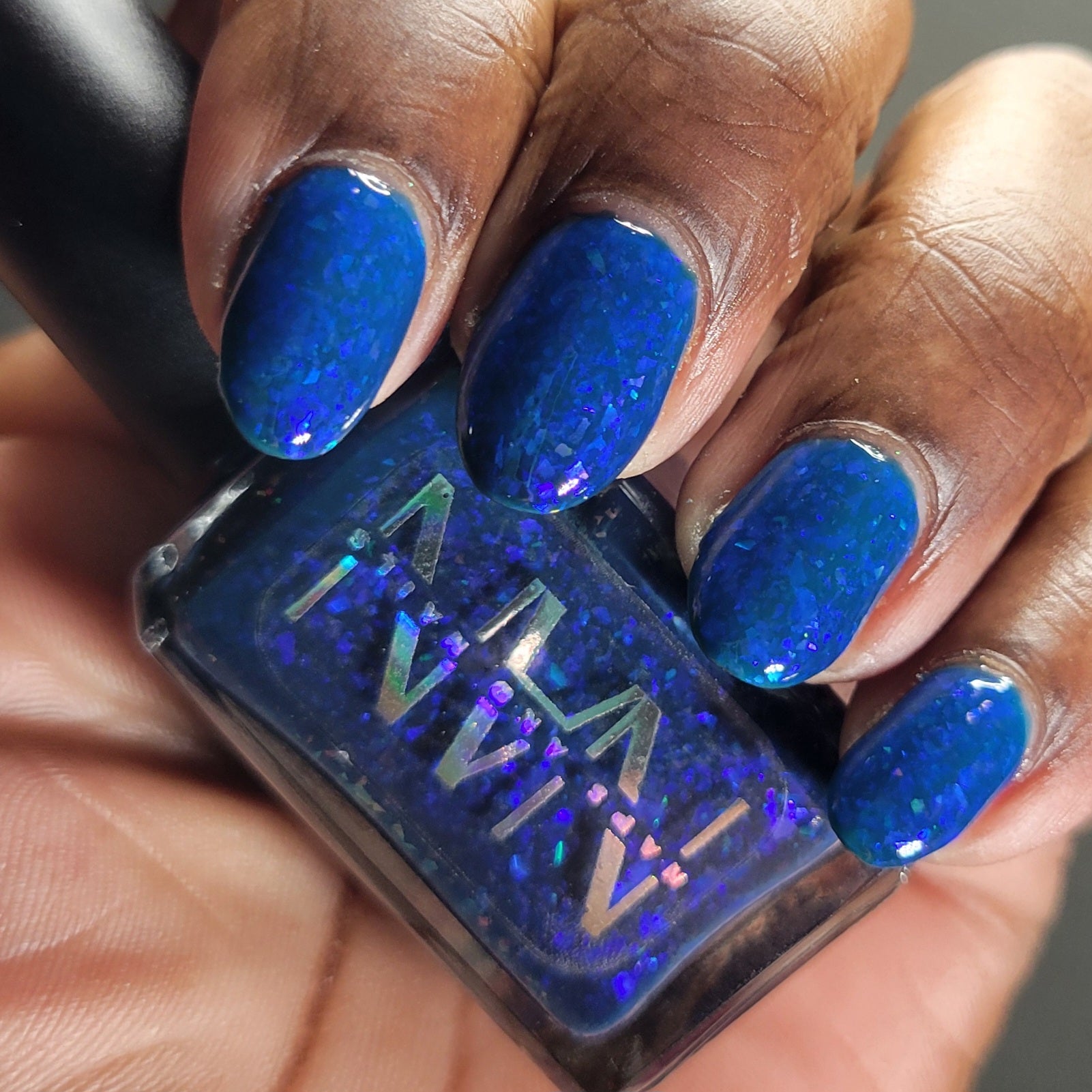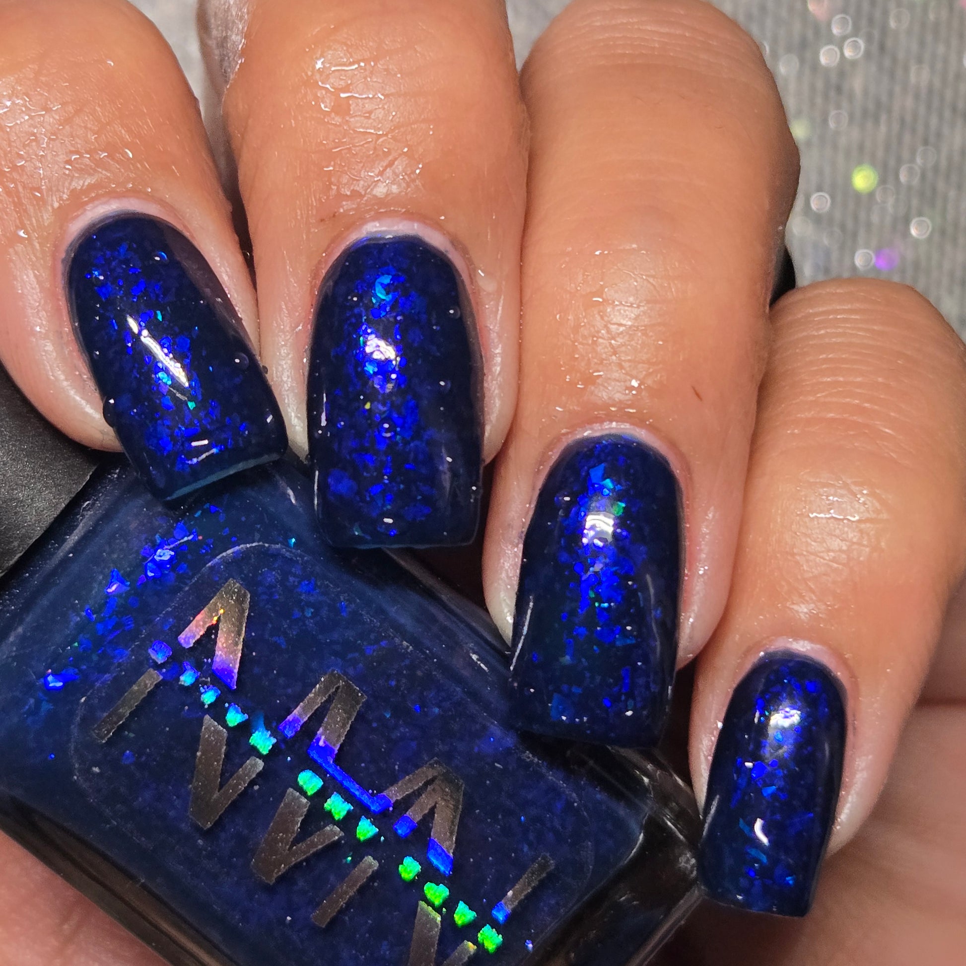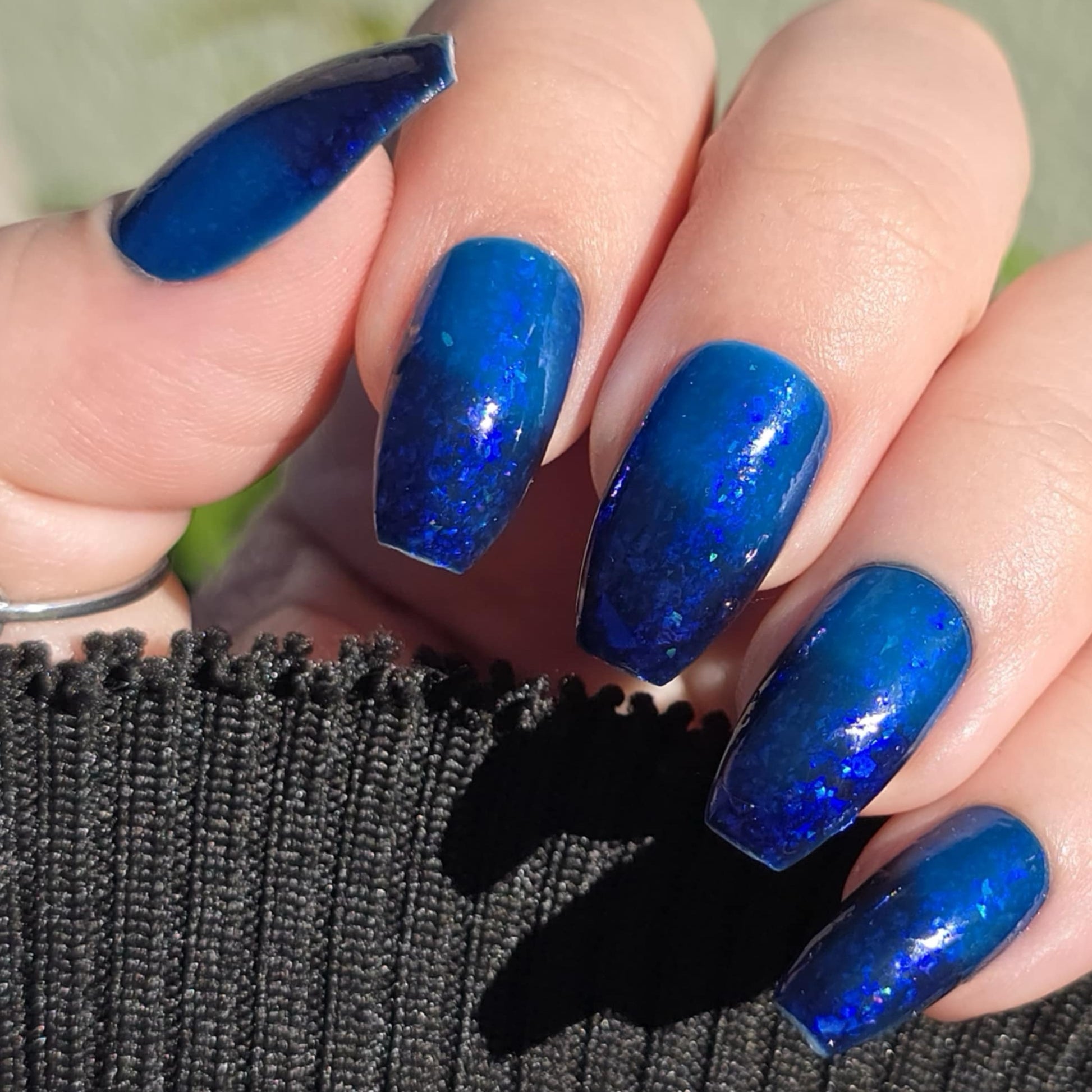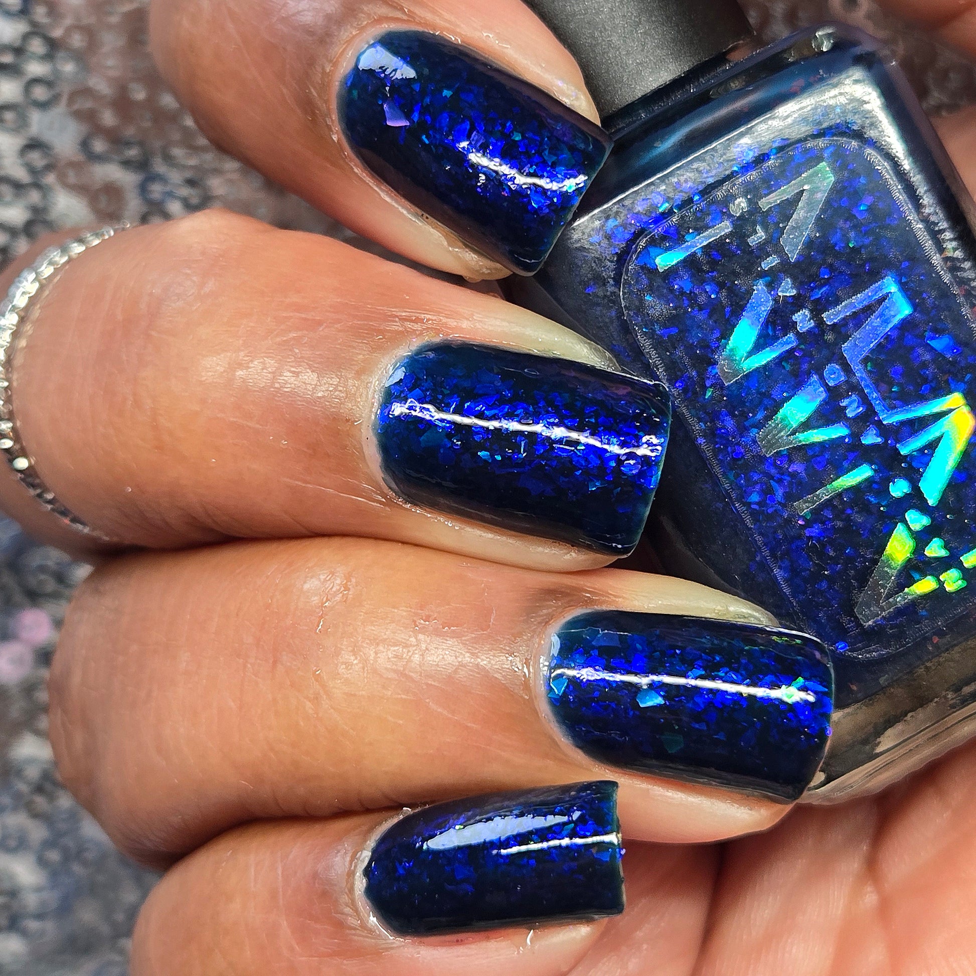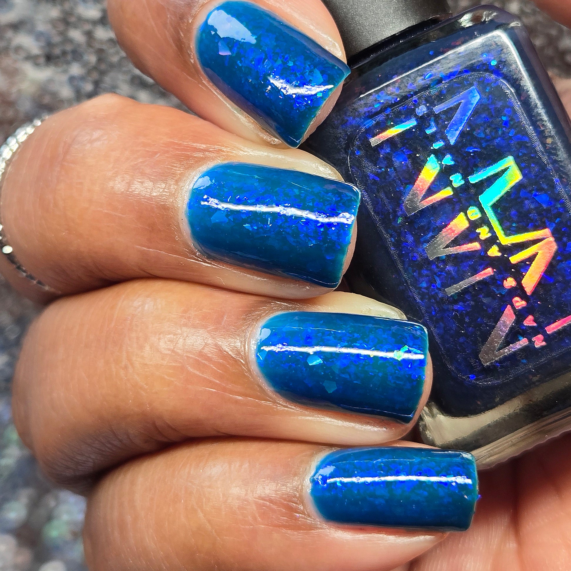 This thermal polish has a blue tone when warm to deep blue black when cold thermal with blue/purple shifting iridescent flakes.