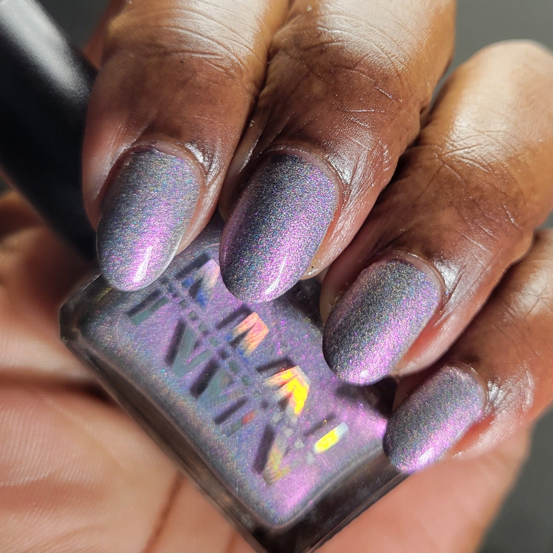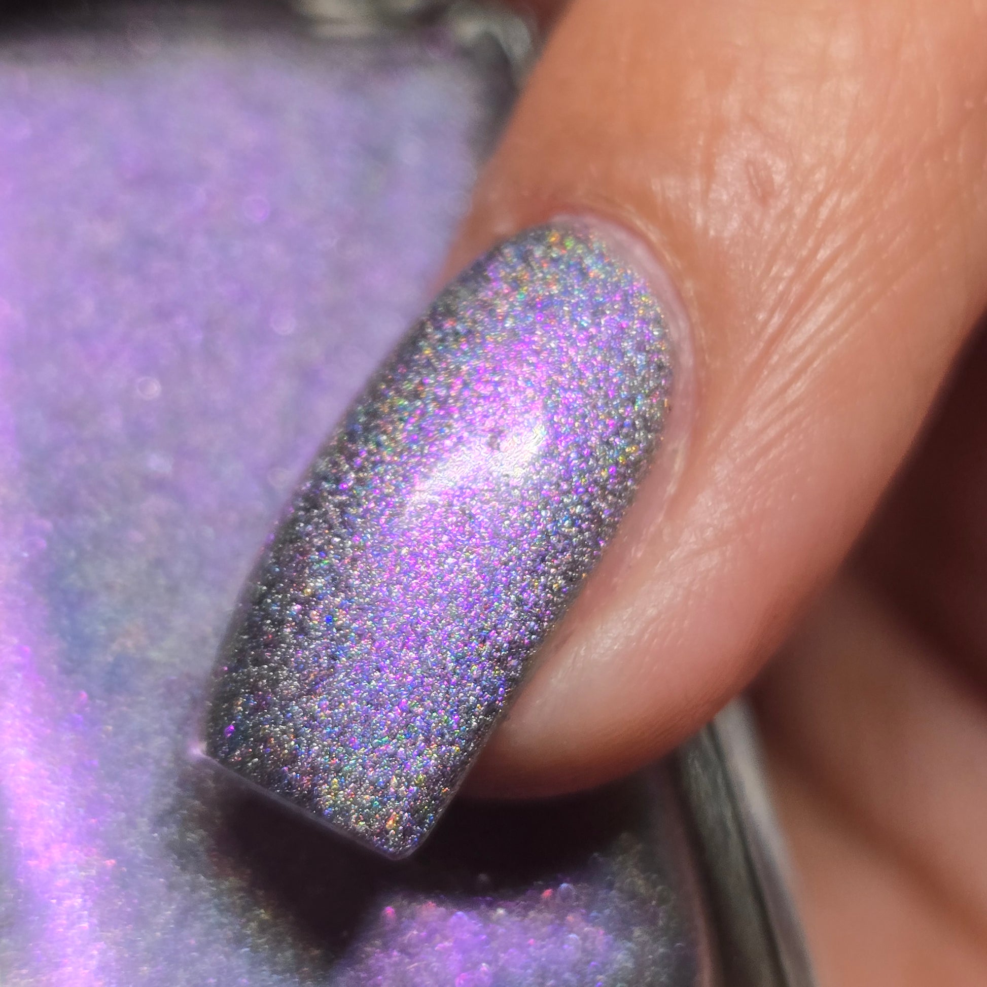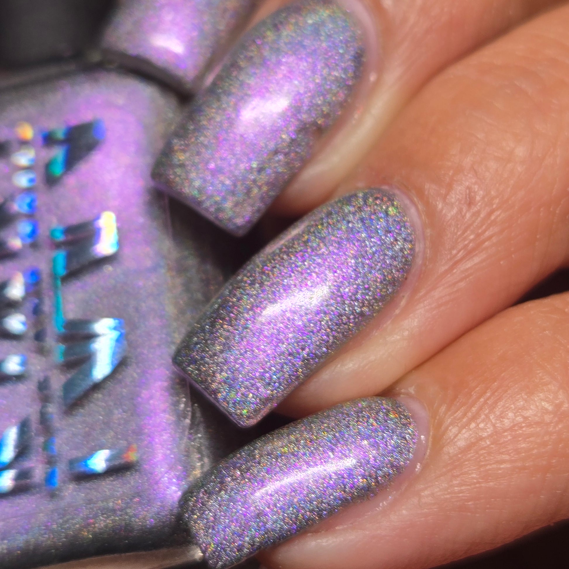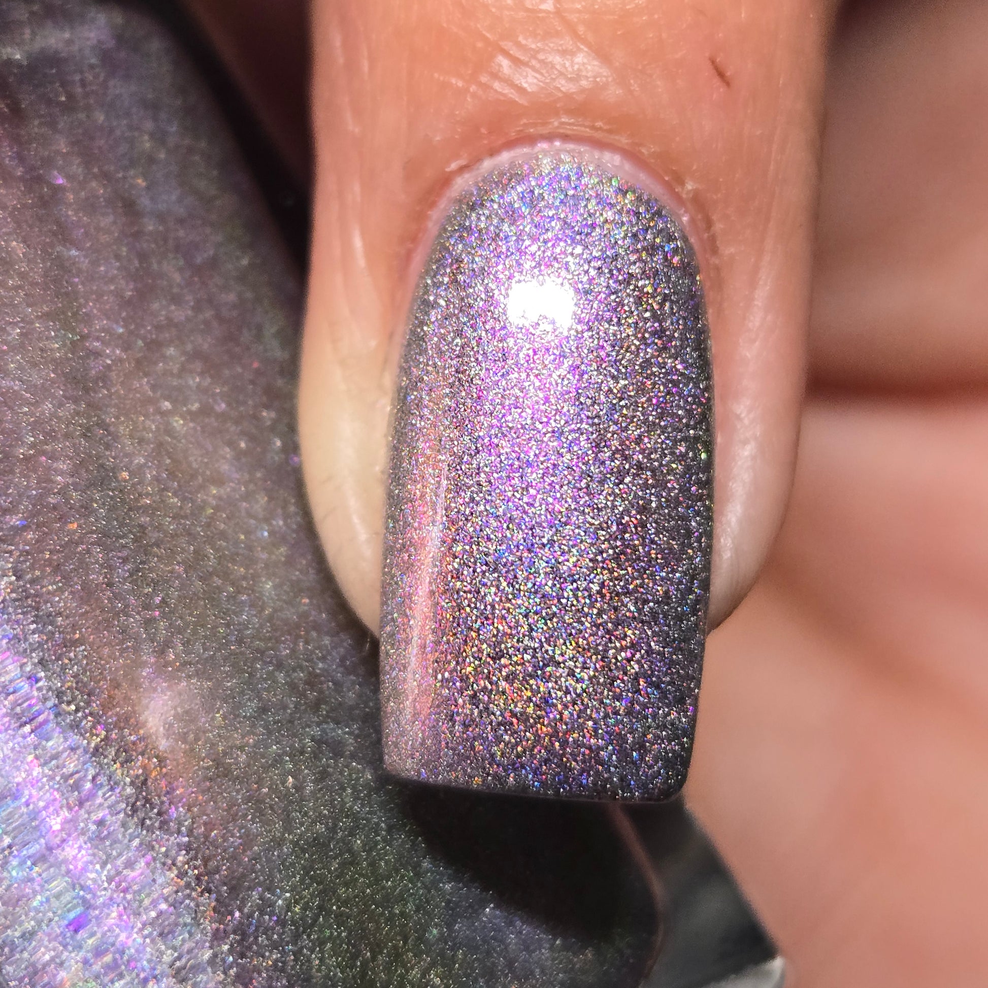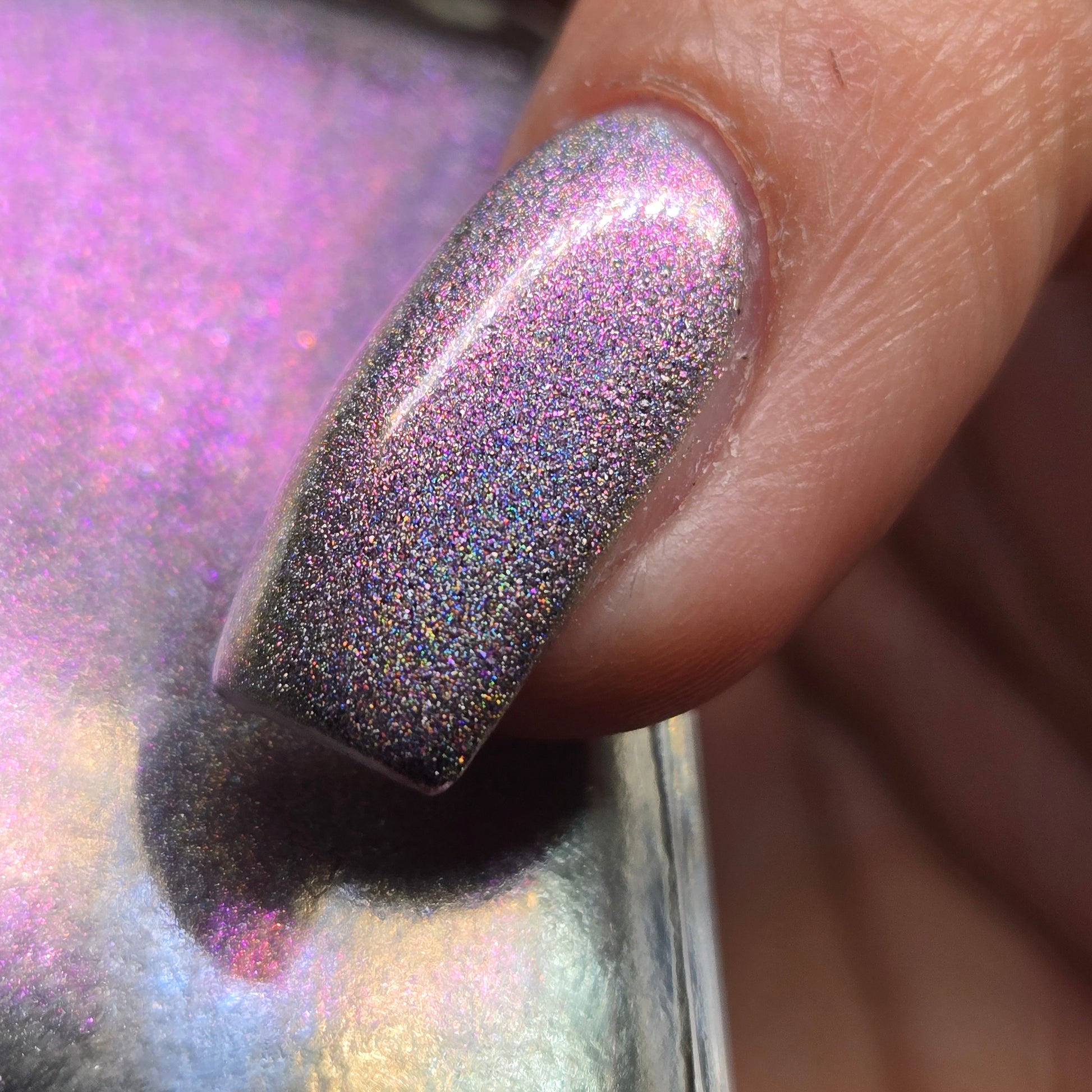 A holographic polish with fuchsia/purple/gold shifting shimmers.