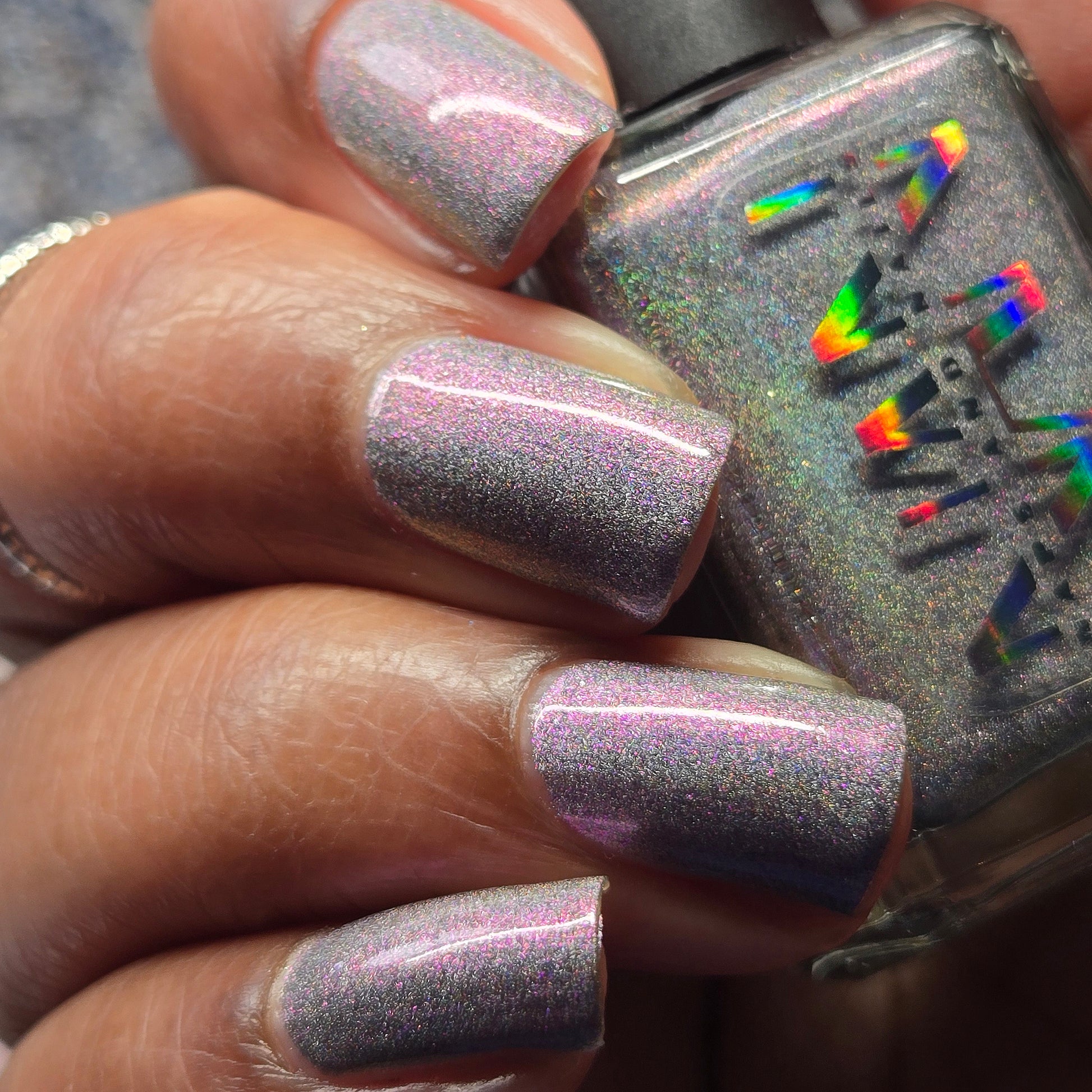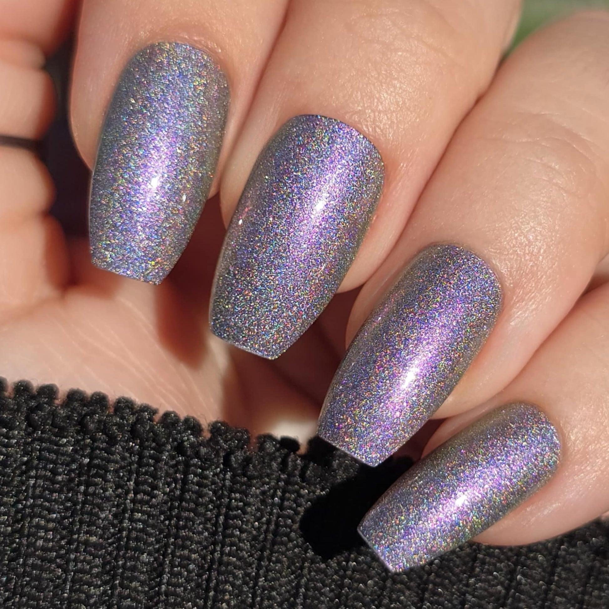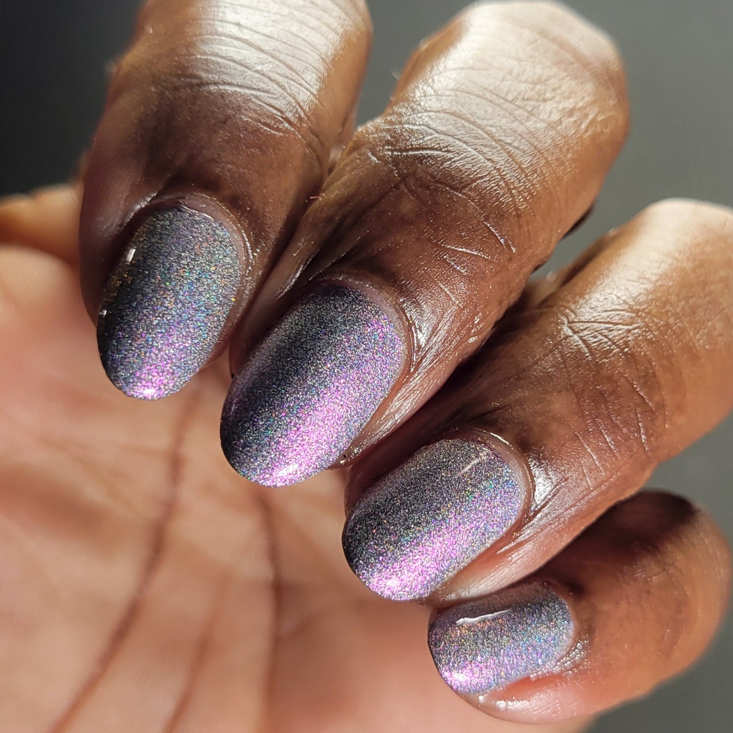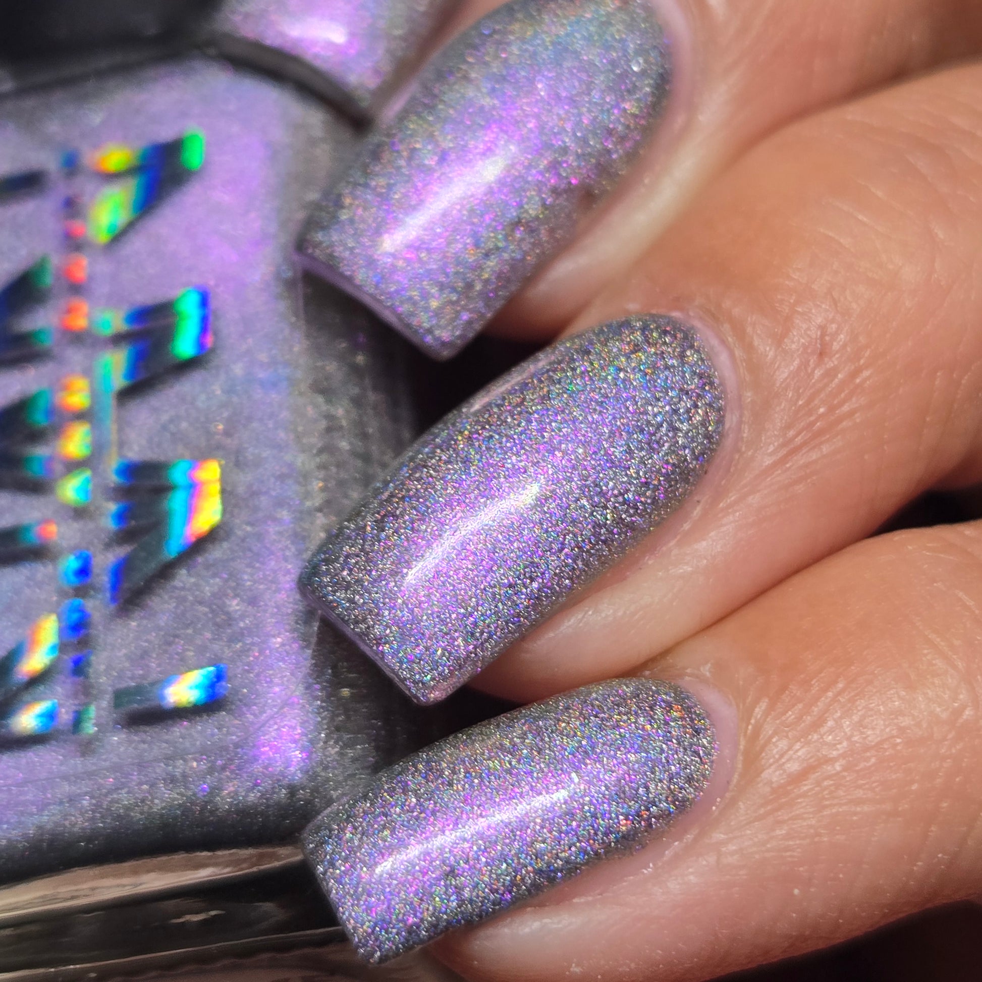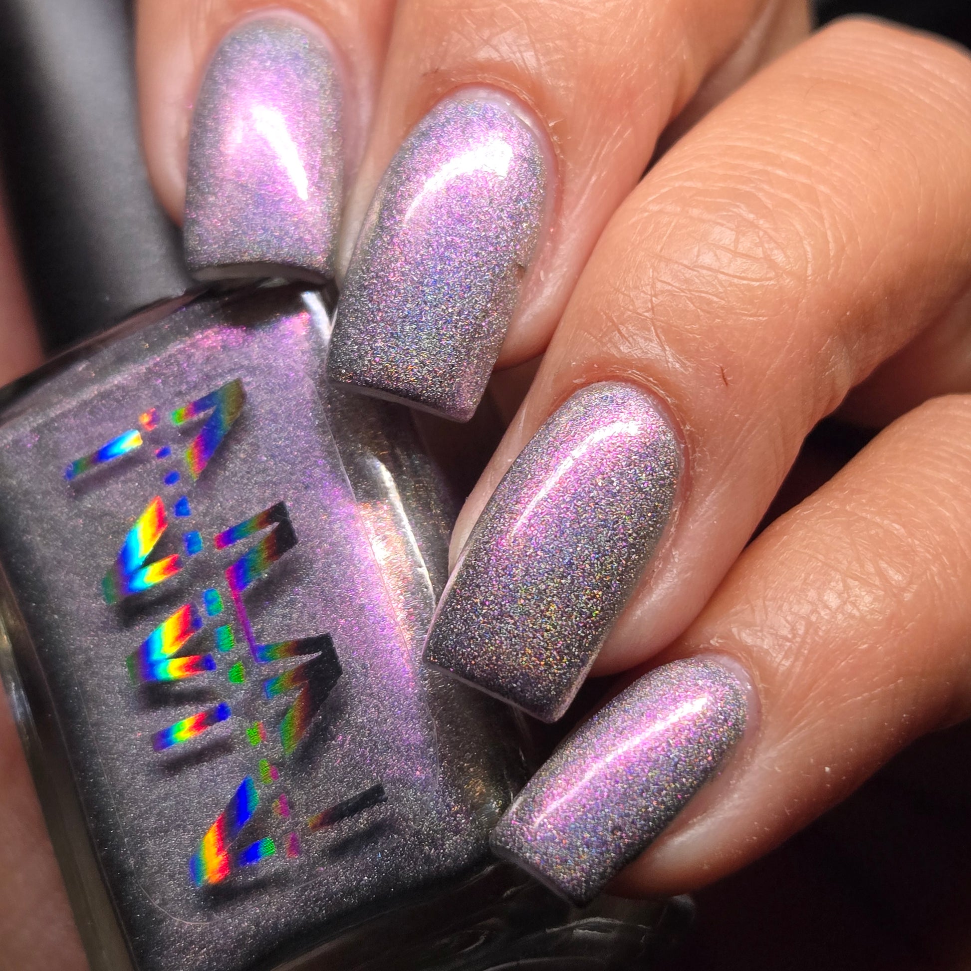A holographic polish with fuchsia/purple/gold shifting shimmers.