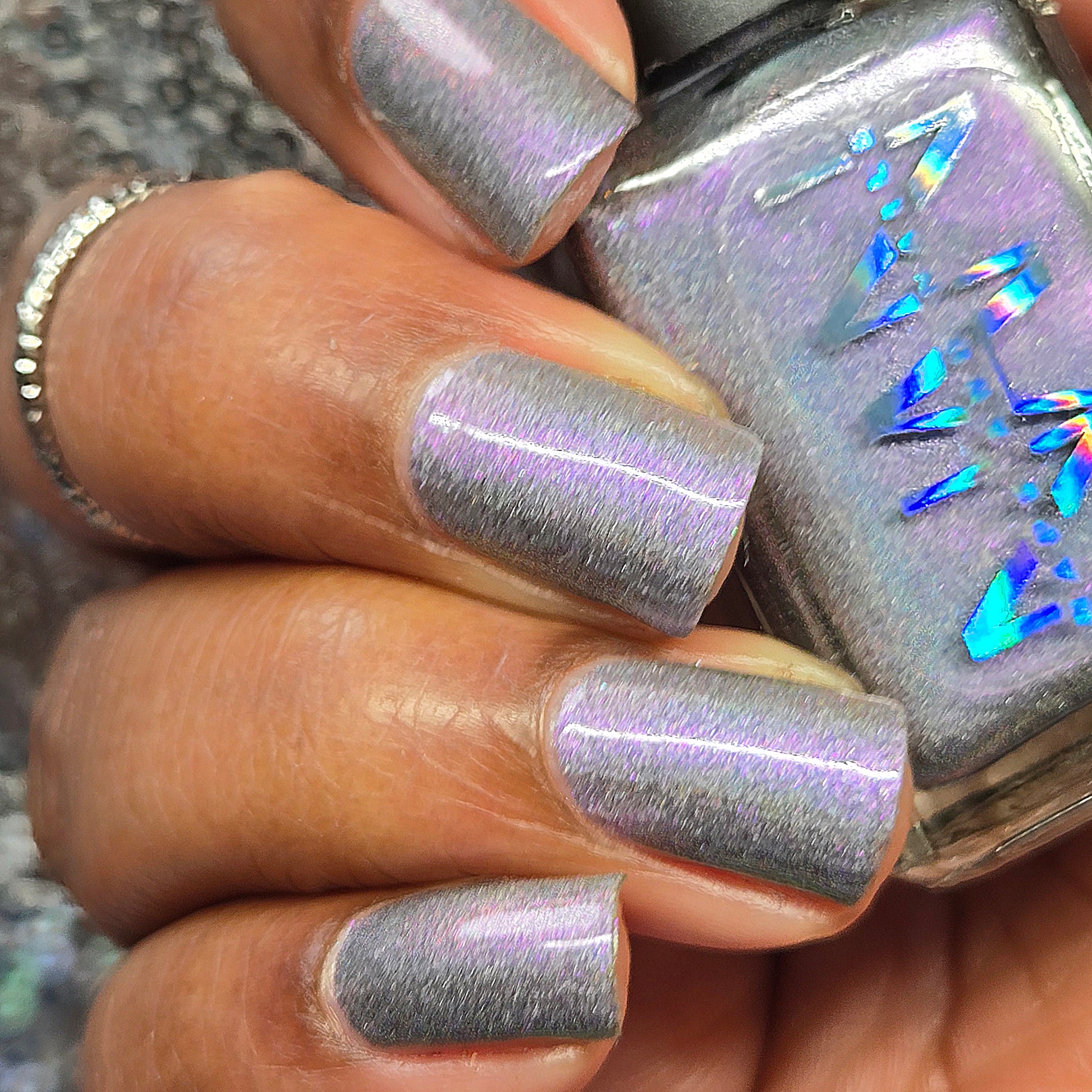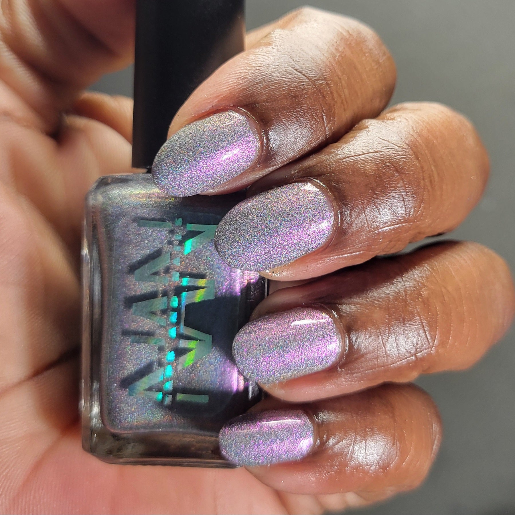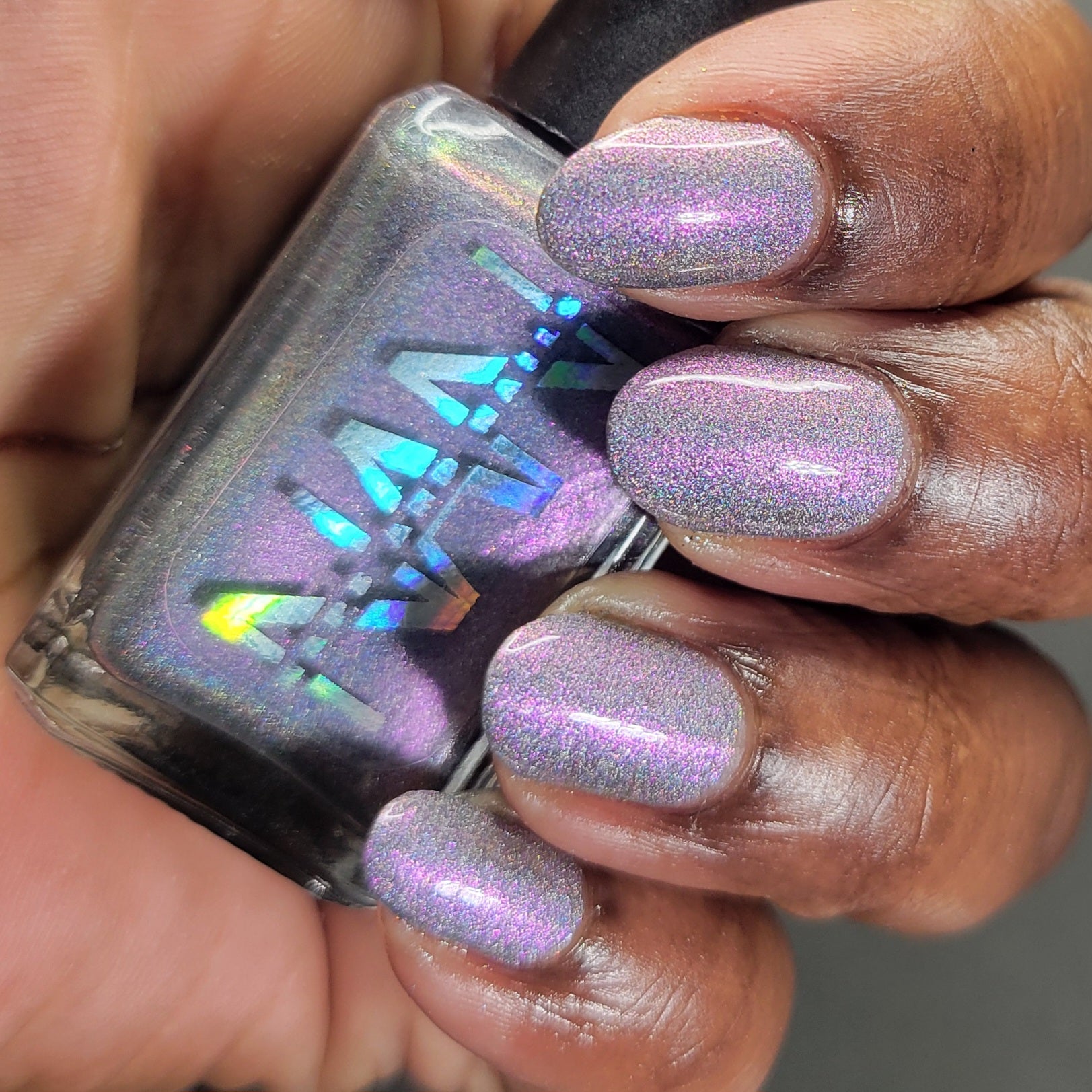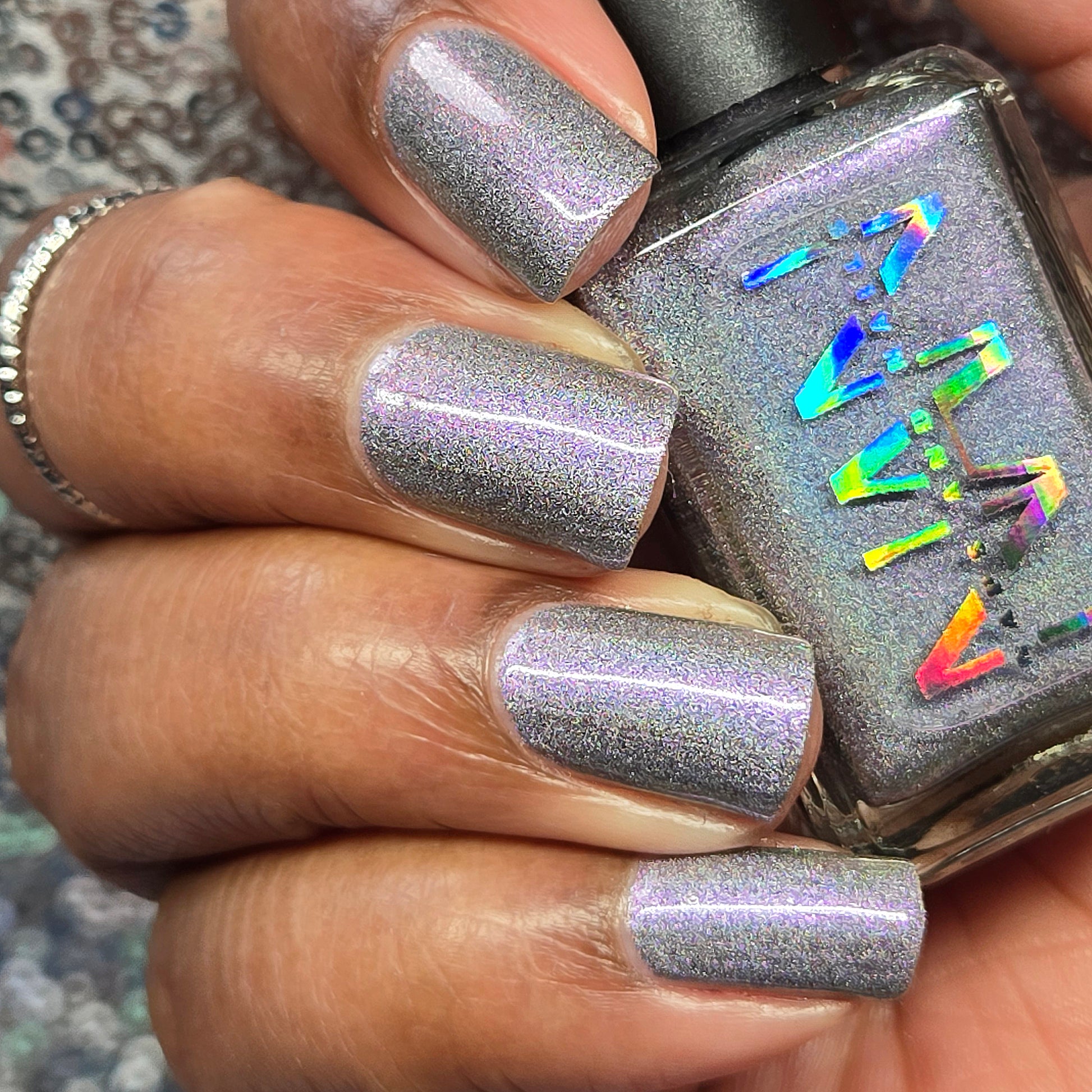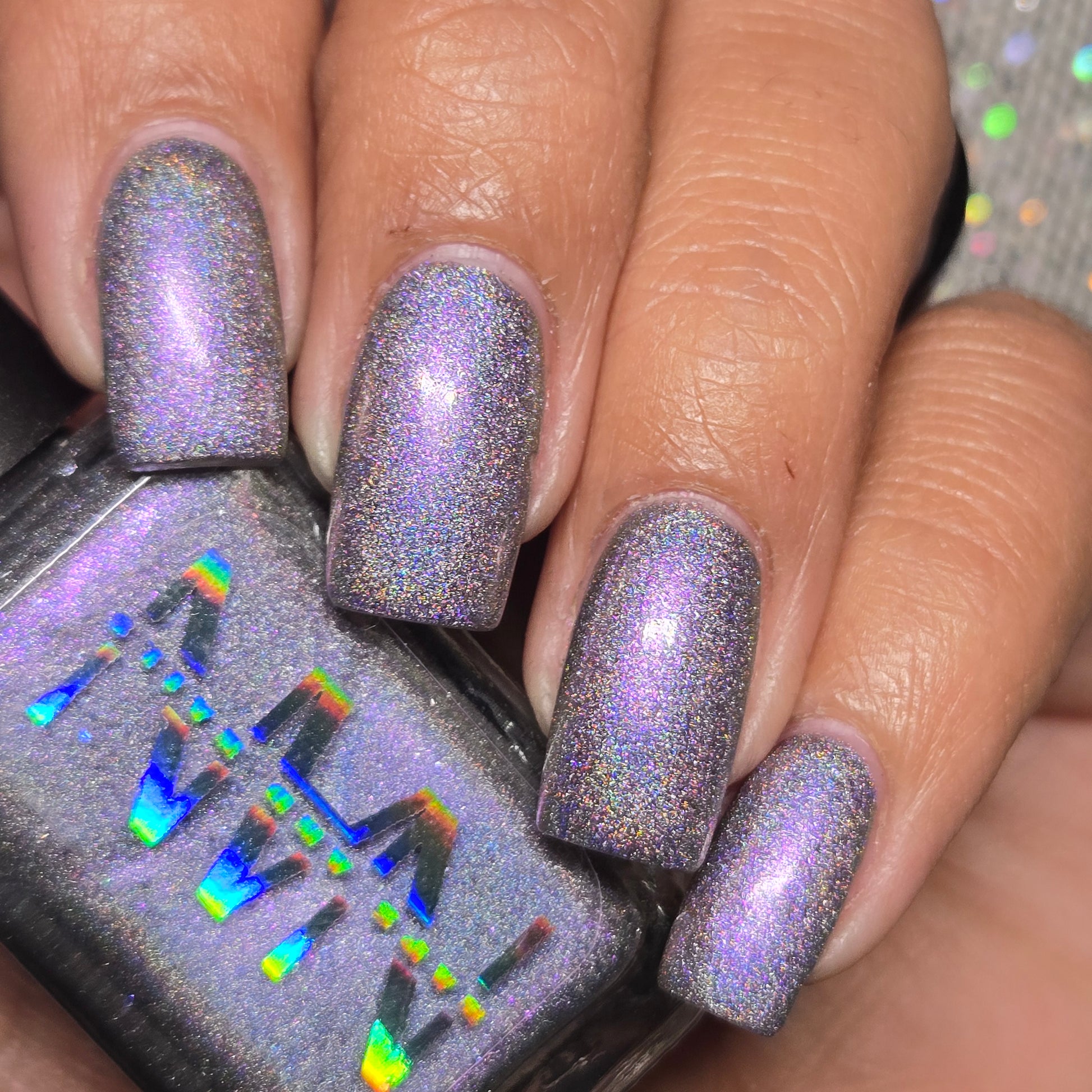 A holographic polish with fuchsia/purple/gold shifting shimmers.