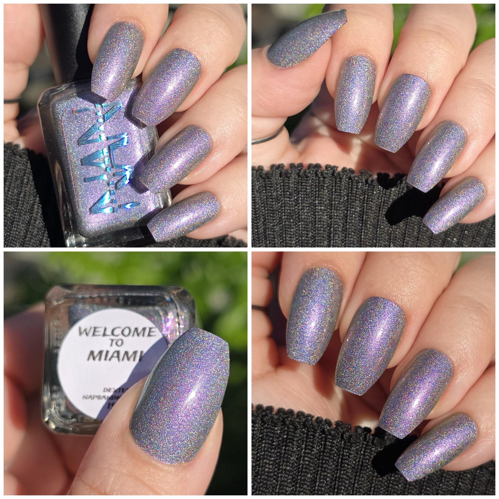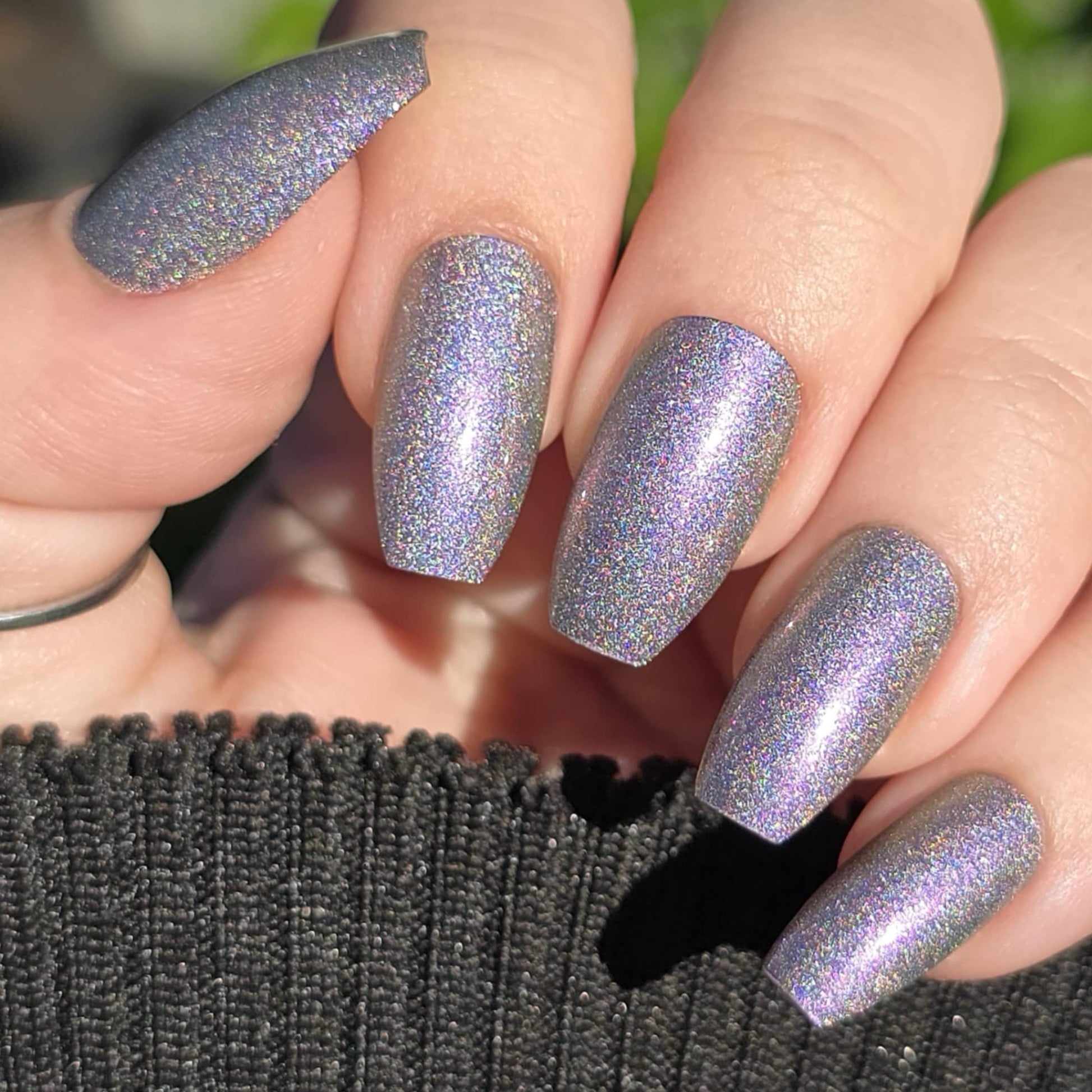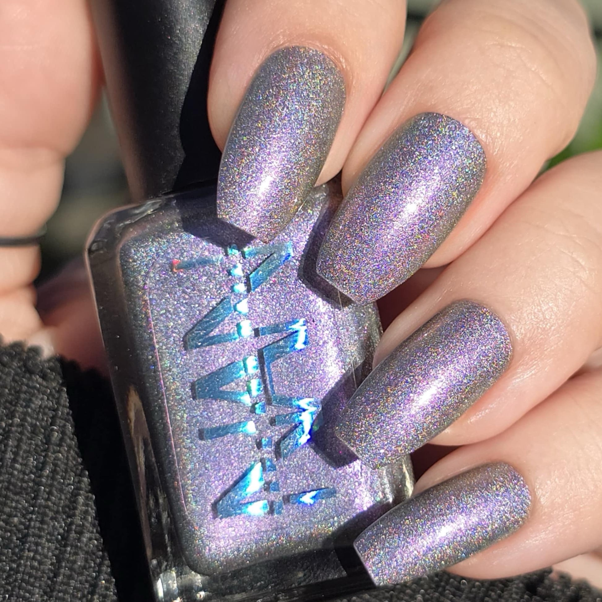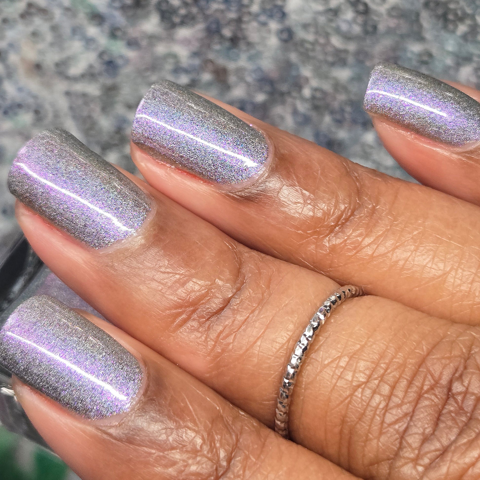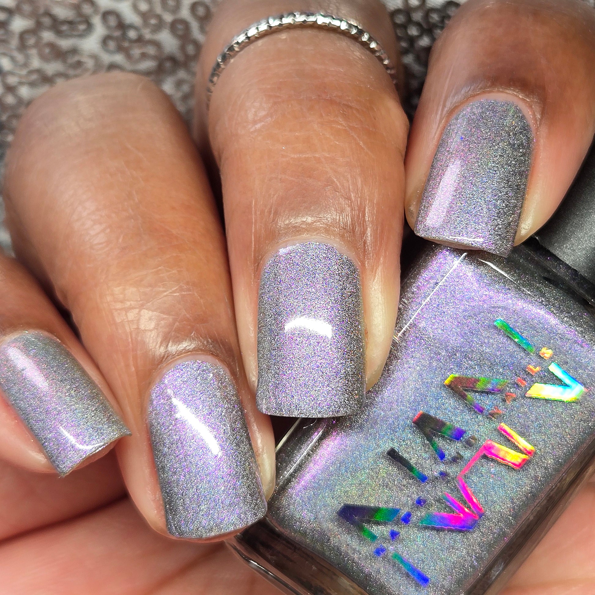 A holographic polish with fuchsia/purple/gold shifting shimmers.